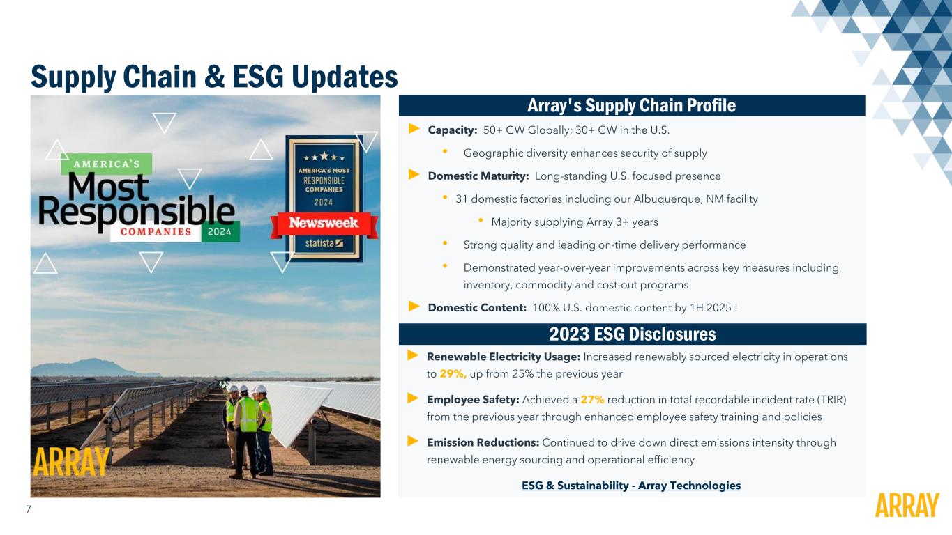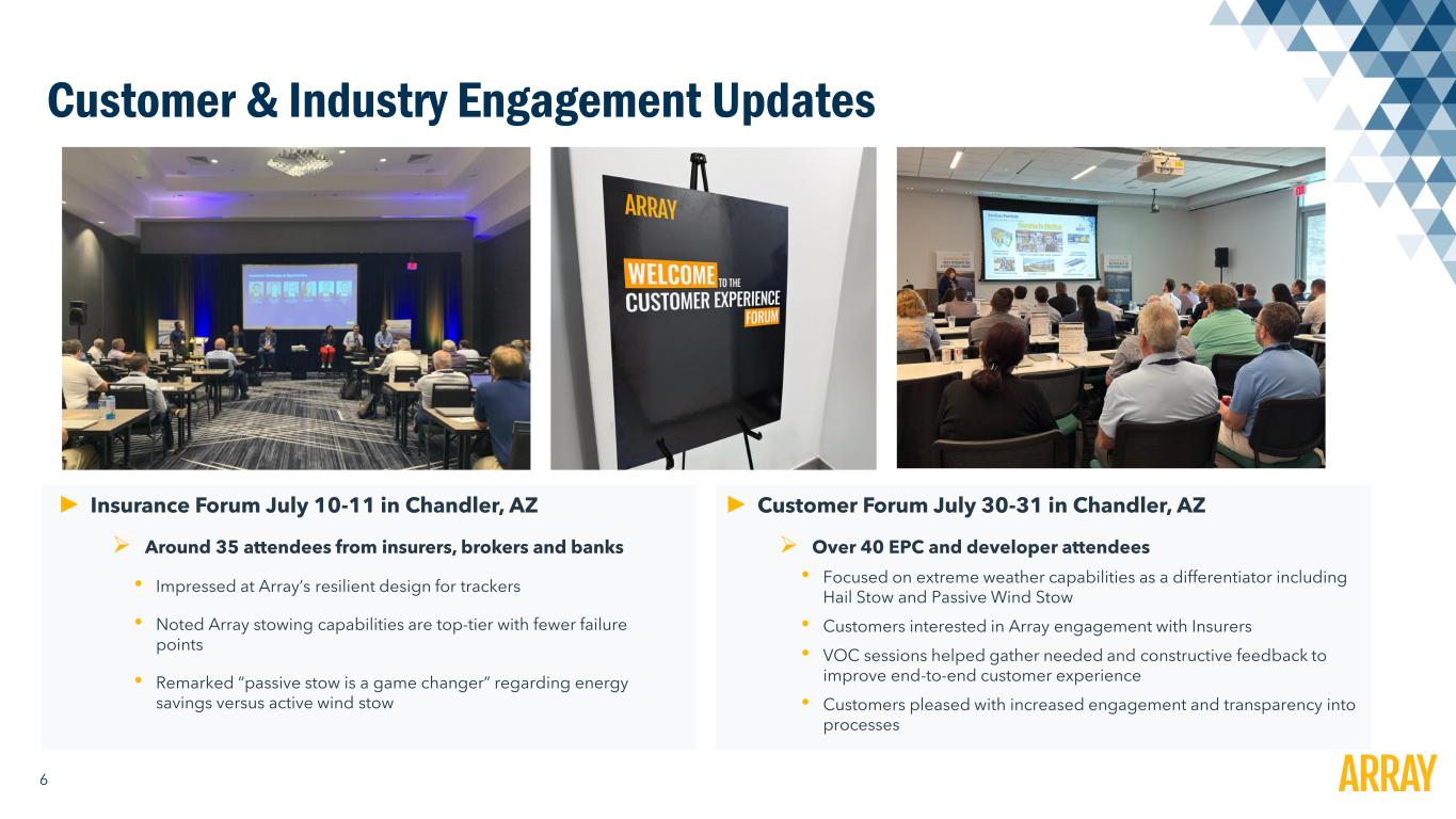 6 Customer & Industry Engagement Updates ► Insurance Forum July 10-11 in Chandler, AZ ➢ Around 35 attendees from insurers, brokers and banks • Impressed at Array’s resilient design for trackers • Noted Array stowing capabilities are top-tier with fewer failure points • Remarked “passive stow is a game changer” regarding energy savings versus active wind stow ► Customer Forum July 30-31 in Chandler, AZ ➢ Over 40 EPC and developer attendees • Focused on extreme weather capabilities as a differentiator including Hail Stow and Passive Wind Stow • Customers interested in Array engagement with Insurers • VOC sessions helped gather needed and constructive feedback to improve end-to-end customer experience • Customers pleased with increased engagement and transparency into processes