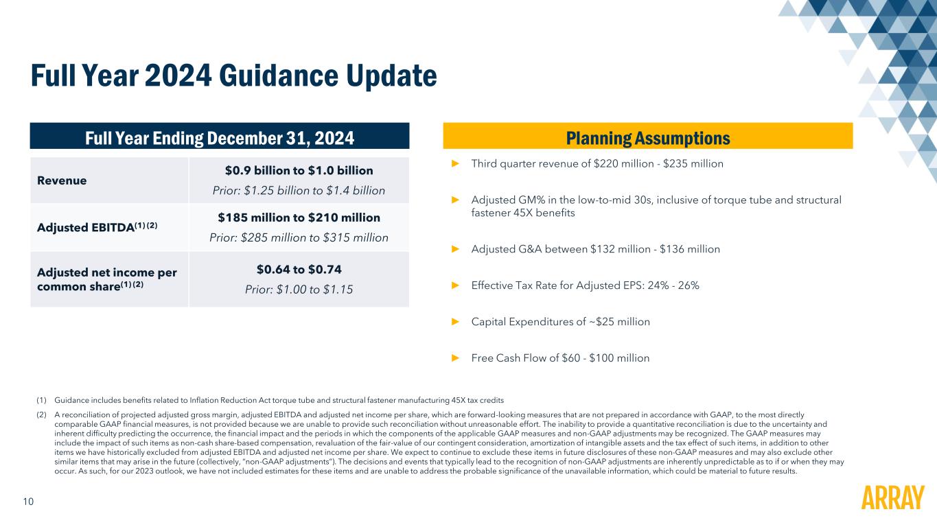 9 Three Months Ended June 30, ($ in millions, except EPS Data) 2024 2023 Y/Y Revenue $255.8 $507.7 ($251.9) Gross margin(1) 33.6% 28.8% + 480 bps Net income (loss) to Common Shareholders(1) $12.0 $52.4 ($40.4) Diluted EPS(1) $0.08 $0.34 ($0.26) Adjusted gross margin(1)(2) 35.0% 29.6% +540 bps Adjusted EBITDA(1)(2) $55.4 $115.6 ($60.2) Adjusted net income(1)(2) $30.6 $74.3 ($43.7) Adjusted, diluted EPS(1)(2) $0.20 $0.49 ($0.29) Free Cash Flow(2) $1.8 $15.0 ($13.2) 2Q 2024 Financial Results 2Q Snapshot Y/Y Comparison (1) All 2Q24 profitability metrics inclusive of incremental 45X benefits through June 30, 2024 (2) See Appendix for reconciliation of non-GAAP measures to the closest GAAP measure ► Revenue down 50% primarily from lower volumes and ASP decline on lower input costs ► Adjusted gross margin increased to 35.0% from 29.6% driven by strong core margin performance coupled with the recognition of 45X benefits for torque tube and structural fasteners ► Adjusted EBITDA of $55.4M, compared to $115.6M in the prior year period driven by lower revenue base year-over- year, partly offset by improved gross margin performance