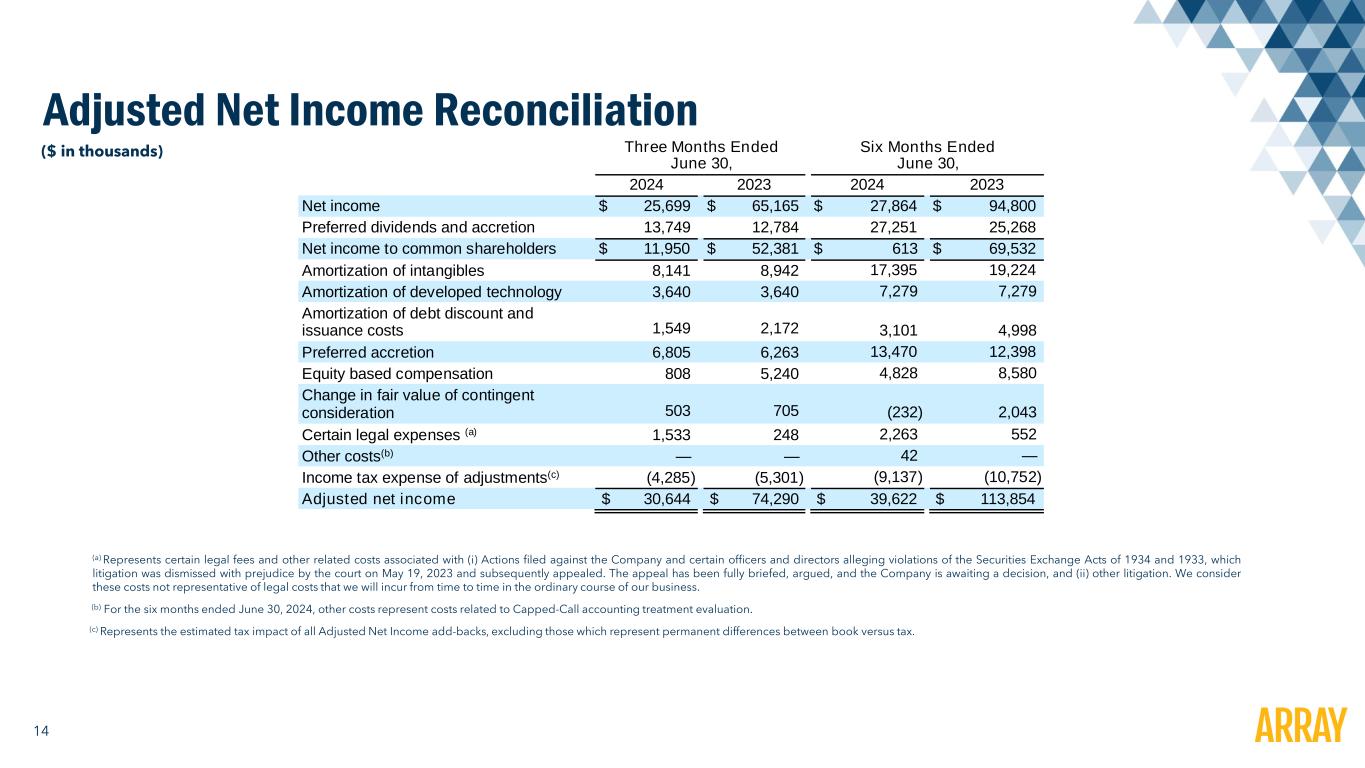 13 Adjusted EBITDA Reconciliation (a) Represents certain legal fees and other related costs associated with (i) Actions filed against the Company and certain officers and directors alleging violations of the Securities Exchange Acts of 1934 and 1933, which litigation was dismissed with prejudice by the court on May 19, 2023 and subsequently appealed. The appeal has been fully briefed, argued, and the Company is awaiting a decision, and (ii) other litigation. We consider these costs not representative of legal costs that we will incur from time to time in the ordinary course of our business. (b) For the six months ended June 30, 2024, other costs represent costs related to Capped-Call accounting treatment evaluation. ($ in thousands) Three Months Ended June 30, Six Months Ended June 30, 2024 2023 2024 2023 Net income $ 25,699 $ 65,165 $ 27,863 $ 94,800 Preferred dividends and accretion 13,749 12,784 27,251 25,268 Net income to common shareholders $ 11,950 $ 52,381 $ 612 $ 69,532 Other expense, net (2,989) (1,593) (7,482) (3,018) Foreign currency loss (gain), net 468 (260) 967 (66) Preferred dividends and accretion 13,749 12,784 27,251 25,268 Interest expense 8,614 11,577 17,554 22,308 Income tax expense 7,810 21,352 9,114 29,675 Depreciation expense 1,155 576 2,038 1,188 Amortization of intangibles 8,141 8,942 17,395 19,224 Amortization of developed technology 3,640 3,640 7,279 7,279 Equity-based compensation 808 5,240 4,828 8,580 Change in fair value of contingent consideration 503 705 (232) 2,043 Certain legal expenses (a) 1,533 248 2,263 552 Other costs (b) — — 42 — Adjusted EBITDA $ 55,382 $ 115,592 $ 81,629 $ 182,565