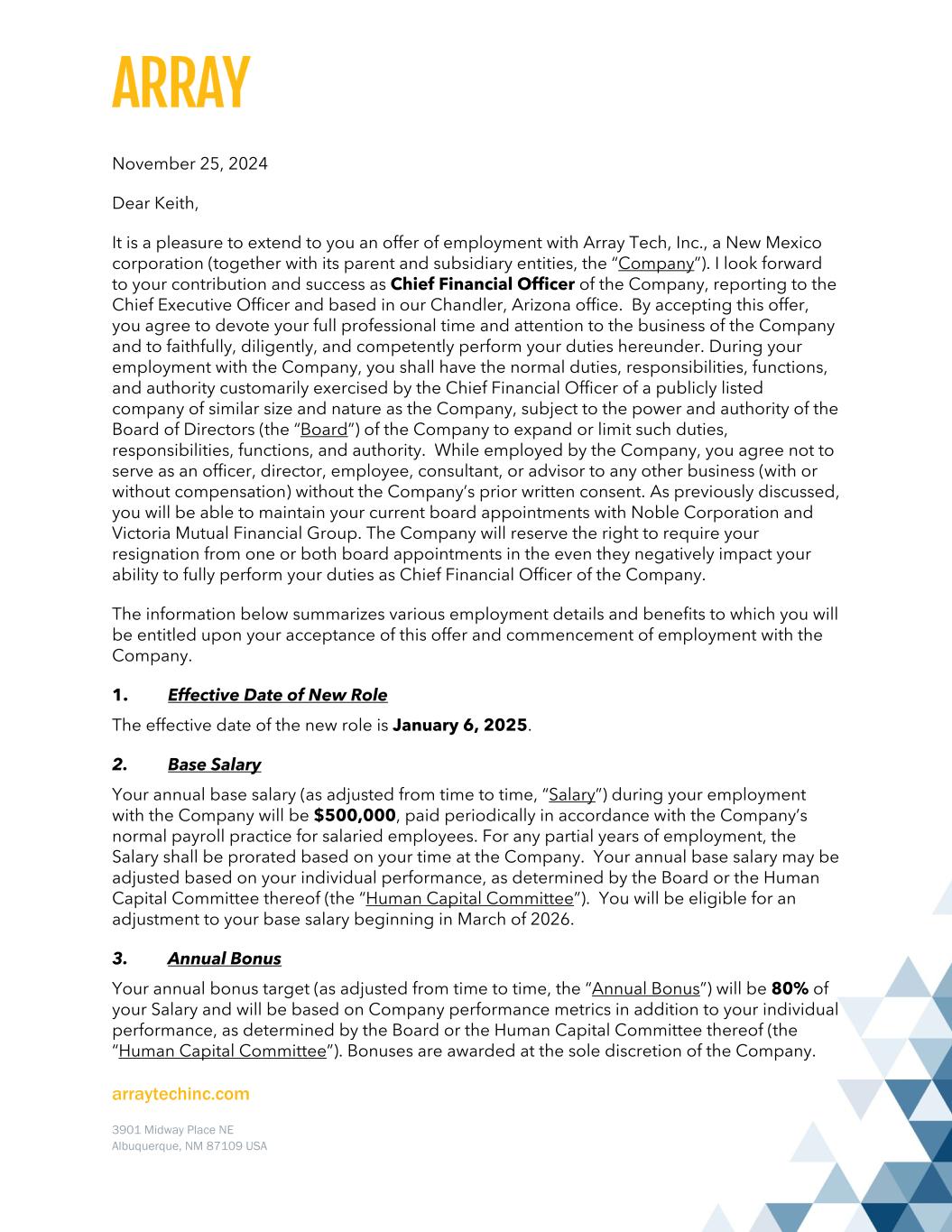 arraytechinc.com 3901 Midway Place NE Albuquerque, NM 87109 USA November 25, 2024 Dear Keith, It is a pleasure to extend to you an offer of employment with Array Tech, Inc., a New Mexico corporation (together with its parent and subsidiary entities, the “Company”). I look forward to your contribution and success as Chief Financial Officer of the Company, reporting to the Chief Executive Officer and based in our Chandler, Arizona office. By accepting this offer, you agree to devote your full professional time and attention to the business of the Company and to faithfully, diligently, and competently perform your duties hereunder. During your employment with the Company, you shall have the normal duties, responsibilities, functions, and authority customarily exercised by the Chief Financial Officer of a publicly listed company of similar size and nature as the Company, subject to the power and authority of the Board of Directors (the “Board”) of the Company to expand or limit such duties, responsibilities, functions, and authority. While employed by the Company, you agree not to serve as an officer, director, employee, consultant, or advisor to any other business (with or without compensation) without the Company’s prior written consent. As previously discussed, you will be able to maintain your current board appointments with Noble Corporation and Victoria Mutual Financial Group. The Company will reserve the right to require your resignation from one or both board appointments in the even they negatively impact your ability to fully perform your duties as Chief Financial Officer of the Company. The information below summarizes various employment details and benefits to which you will be entitled upon your acceptance of this offer and commencement of employment with the Company. 1. Effective Date of New Role The effective date of the new role is January 6, 2025. 2. Base Salary Your annual base salary (as adjusted from time to time, “Salary”) during your employment with the Company will be $500,000, paid periodically in accordance with the Company’s normal payroll practice for salaried employees. For any partial years of employment, the Salary shall be prorated based on your time at the Company. Your annual base salary may be adjusted based on your individual performance, as determined by the Board or the Human Capital Committee thereof (the “Human Capital Committee”). You will be eligible for an adjustment to your base salary beginning in March of 2026. 3. Annual Bonus Your annual bonus target (as adjusted from time to time, the “Annual Bonus”) will be 80% of your Salary and will be based on Company performance metrics in addition to your individual performance, as determined by the Board or the Human Capital Committee thereof (the “Human Capital Committee”). Bonuses are awarded at the sole discretion of the Company.