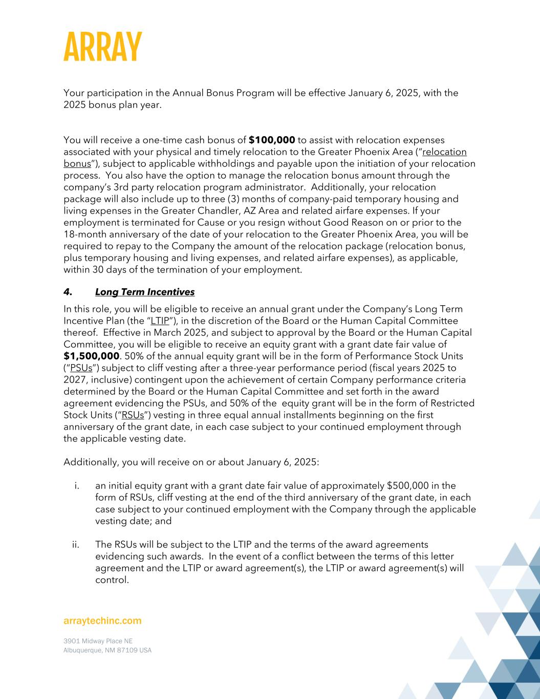 arraytechinc.com 3901 Midway Place NE Albuquerque, NM 87109 USA Your participation in the Annual Bonus Program will be effective January 6, 2025, with the 2025 bonus plan year. You will receive a one-time cash bonus of $100,000 to assist with relocation expenses associated with your physical and timely relocation to the Greater Phoenix Area (“relocation bonus”), subject to applicable withholdings and payable upon the initiation of your relocation process. You also have the option to manage the relocation bonus amount through the company’s 3rd party relocation program administrator. Additionally, your relocation package will also include up to three (3) months of company-paid temporary housing and living expenses in the Greater Chandler, AZ Area and related airfare expenses. If your employment is terminated for Cause or you resign without Good Reason on or prior to the 18-month anniversary of the date of your relocation to the Greater Phoenix Area, you will be required to repay to the Company the amount of the relocation package (relocation bonus, plus temporary housing and living expenses, and related airfare expenses), as applicable, within 30 days of the termination of your employment. 4. Long Term Incentives In this role, you will be eligible to receive an annual grant under the Company’s Long Term Incentive Plan (the “LTIP”), in the discretion of the Board or the Human Capital Committee thereof. Effective in March 2025, and subject to approval by the Board or the Human Capital Committee, you will be eligible to receive an equity grant with a grant date fair value of $1,500,000. 50% of the annual equity grant will be in the form of Performance Stock Units (“PSUs”) subject to cliff vesting after a three-year performance period (fiscal years 2025 to 2027, inclusive) contingent upon the achievement of certain Company performance criteria determined by the Board or the Human Capital Committee and set forth in the award agreement evidencing the PSUs, and 50% of the equity grant will be in the form of Restricted Stock Units (“RSUs”) vesting in three equal annual installments beginning on the first anniversary of the grant date, in each case subject to your continued employment through the applicable vesting date. Additionally, you will receive on or about January 6, 2025: i. an initial equity grant with a grant date fair value of approximately $500,000 in the form of RSUs, cliff vesting at the end of the third anniversary of the grant date, in each case subject to your continued employment with the Company through the applicable vesting date; and ii. The RSUs will be subject to the LTIP and the terms of the award agreements evidencing such awards. In the event of a conflict between the terms of this letter agreement and the LTIP or award agreement(s), the LTIP or award agreement(s) will control.
