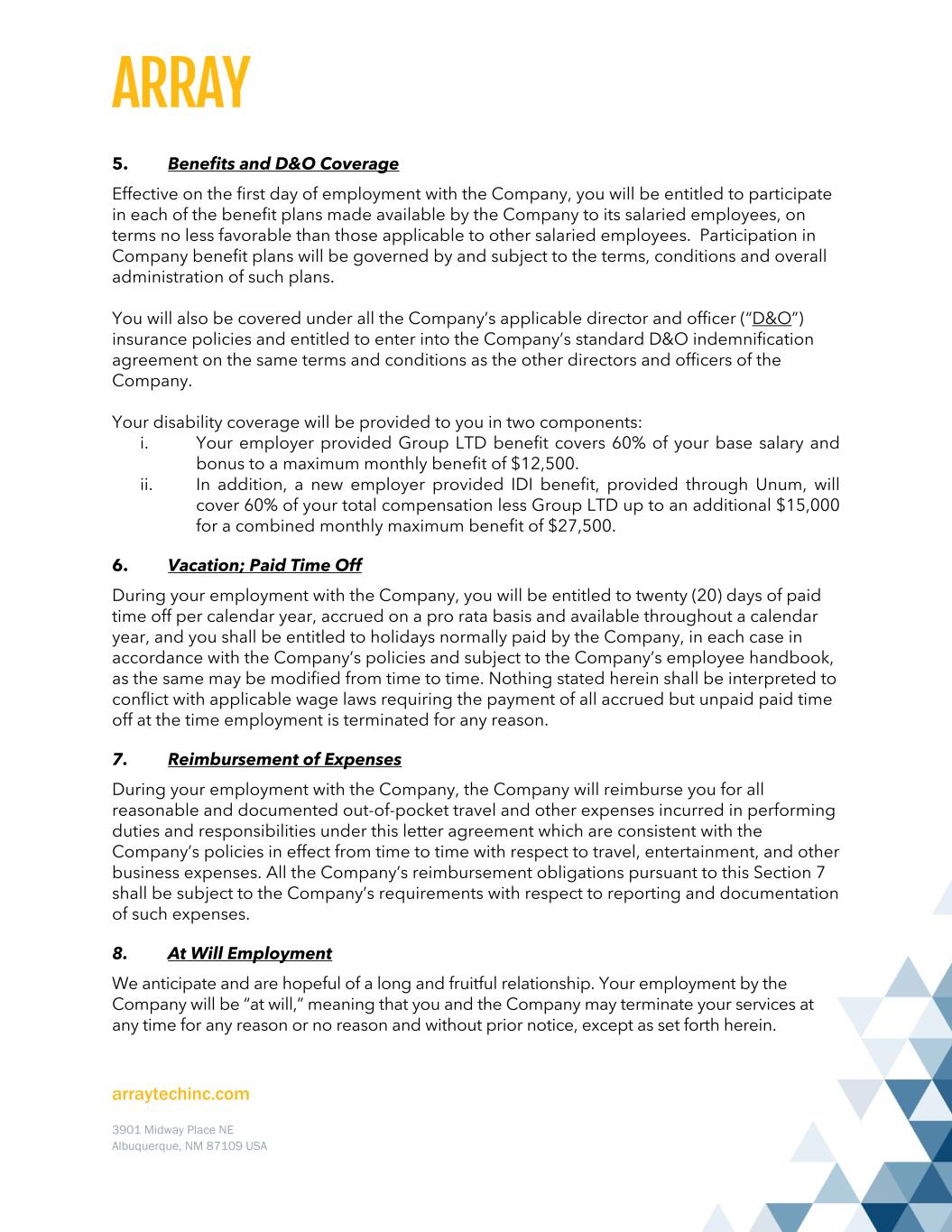 arraytechinc.com 3901 Midway Place NE Albuquerque, NM 87109 USA 5. Benefits and D&O Coverage Effective on the first day of employment with the Company, you will be entitled to participate in each of the benefit plans made available by the Company to its salaried employees, on terms no less favorable than those applicable to other salaried employees. Participation in Company benefit plans will be governed by and subject to the terms, conditions and overall administration of such plans. You will also be covered under all the Company’s applicable director and officer (“D&O”) insurance policies and entitled to enter into the Company’s standard D&O indemnification agreement on the same terms and conditions as the other directors and officers of the Company. Your disability coverage will be provided to you in two components: i. Your employer provided Group LTD benefit covers 60% of your base salary and bonus to a maximum monthly benefit of $12,500. ii. In addition, a new employer provided IDI benefit, provided through Unum, will cover 60% of your total compensation less Group LTD up to an additional $15,000 for a combined monthly maximum benefit of $27,500. 6. Vacation; Paid Time Off During your employment with the Company, you will be entitled to twenty (20) days of paid time off per calendar year, accrued on a pro rata basis and available throughout a calendar year, and you shall be entitled to holidays normally paid by the Company, in each case in accordance with the Company’s policies and subject to the Company’s employee handbook, as the same may be modified from time to time. Nothing stated herein shall be interpreted to conflict with applicable wage laws requiring the payment of all accrued but unpaid paid time off at the time employment is terminated for any reason. 7. Reimbursement of Expenses During your employment with the Company, the Company will reimburse you for all reasonable and documented out-of-pocket travel and other expenses incurred in performing duties and responsibilities under this letter agreement which are consistent with the Company’s policies in effect from time to time with respect to travel, entertainment, and other business expenses. All the Company’s reimbursement obligations pursuant to this Section 7 shall be subject to the Company’s requirements with respect to reporting and documentation of such expenses. 8. At Will Employment We anticipate and are hopeful of a long and fruitful relationship. Your employment by the Company will be “at will,” meaning that you and the Company may terminate your services at any time for any reason or no reason and without prior notice, except as set forth herein.