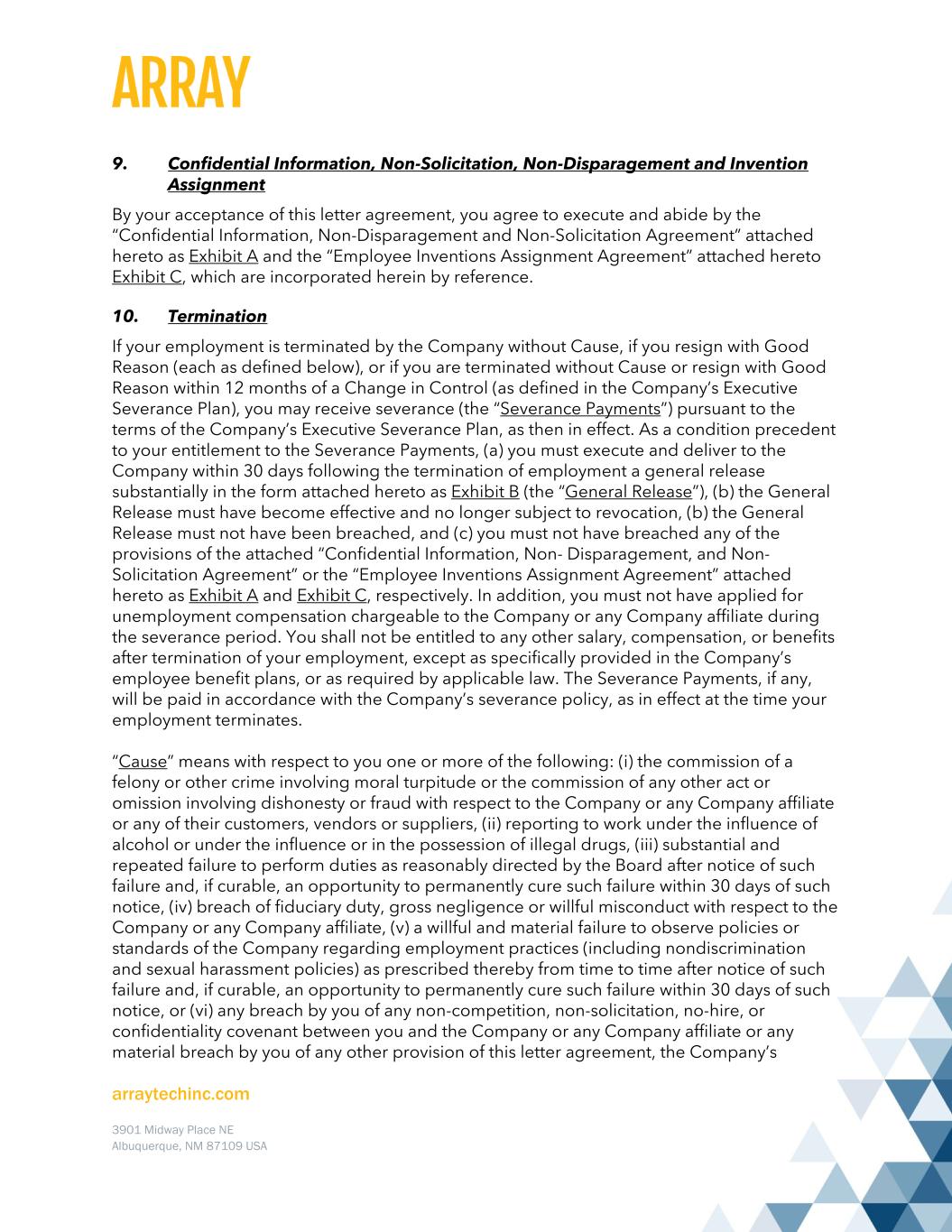 arraytechinc.com 3901 Midway Place NE Albuquerque, NM 87109 USA 9. Confidential Information, Non-Solicitation, Non-Disparagement and Invention Assignment By your acceptance of this letter agreement, you agree to execute and abide by the “Confidential Information, Non-Disparagement and Non-Solicitation Agreement” attached hereto as Exhibit A and the “Employee Inventions Assignment Agreement” attached hereto Exhibit C, which are incorporated herein by reference. 10. Termination If your employment is terminated by the Company without Cause, if you resign with Good Reason (each as defined below), or if you are terminated without Cause or resign with Good Reason within 12 months of a Change in Control (as defined in the Company’s Executive Severance Plan), you may receive severance (the “Severance Payments”) pursuant to the terms of the Company’s Executive Severance Plan, as then in effect. As a condition precedent to your entitlement to the Severance Payments, (a) you must execute and deliver to the Company within 30 days following the termination of employment a general release substantially in the form attached hereto as Exhibit B (the “General Release”), (b) the General Release must have become effective and no longer subject to revocation, (b) the General Release must not have been breached, and (c) you must not have breached any of the provisions of the attached “Confidential Information, Non- Disparagement, and Non- Solicitation Agreement” or the “Employee Inventions Assignment Agreement” attached hereto as Exhibit A and Exhibit C, respectively. In addition, you must not have applied for unemployment compensation chargeable to the Company or any Company affiliate during the severance period. You shall not be entitled to any other salary, compensation, or benefits after termination of your employment, except as specifically provided in the Company’s employee benefit plans, or as required by applicable law. The Severance Payments, if any, will be paid in accordance with the Company’s severance policy, as in effect at the time your employment terminates. “Cause” means with respect to you one or more of the following: (i) the commission of a felony or other crime involving moral turpitude or the commission of any other act or omission involving dishonesty or fraud with respect to the Company or any Company affiliate or any of their customers, vendors or suppliers, (ii) reporting to work under the influence of alcohol or under the influence or in the possession of illegal drugs, (iii) substantial and repeated failure to perform duties as reasonably directed by the Board after notice of such failure and, if curable, an opportunity to permanently cure such failure within 30 days of such notice, (iv) breach of fiduciary duty, gross negligence or willful misconduct with respect to the Company or any Company affiliate, (v) a willful and material failure to observe policies or standards of the Company regarding employment practices (including nondiscrimination and sexual harassment policies) as prescribed thereby from time to time after notice of such failure and, if curable, an opportunity to permanently cure such failure within 30 days of such notice, or (vi) any breach by you of any non-competition, non-solicitation, no-hire, or confidentiality covenant between you and the Company or any Company affiliate or any material breach by you of any other provision of this letter agreement, the Company’s