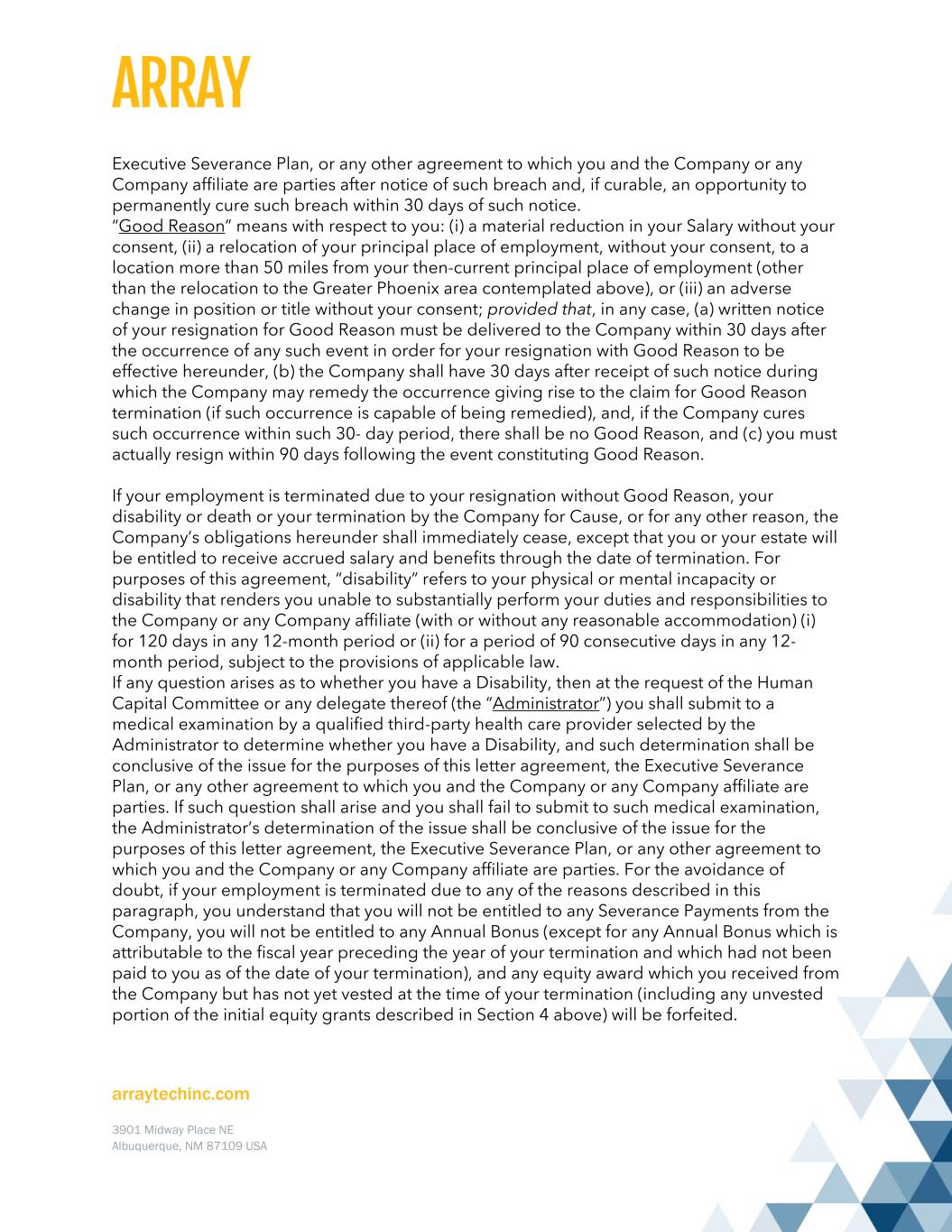 arraytechinc.com 3901 Midway Place NE Albuquerque, NM 87109 USA Executive Severance Plan, or any other agreement to which you and the Company or any Company affiliate are parties after notice of such breach and, if curable, an opportunity to permanently cure such breach within 30 days of such notice. “Good Reason” means with respect to you: (i) a material reduction in your Salary without your consent, (ii) a relocation of your principal place of employment, without your consent, to a location more than 50 miles from your then-current principal place of employment (other than the relocation to the Greater Phoenix area contemplated above), or (iii) an adverse change in position or title without your consent; provided that, in any case, (a) written notice of your resignation for Good Reason must be delivered to the Company within 30 days after the occurrence of any such event in order for your resignation with Good Reason to be effective hereunder, (b) the Company shall have 30 days after receipt of such notice during which the Company may remedy the occurrence giving rise to the claim for Good Reason termination (if such occurrence is capable of being remedied), and, if the Company cures such occurrence within such 30- day period, there shall be no Good Reason, and (c) you must actually resign within 90 days following the event constituting Good Reason. If your employment is terminated due to your resignation without Good Reason, your disability or death or your termination by the Company for Cause, or for any other reason, the Company’s obligations hereunder shall immediately cease, except that you or your estate will be entitled to receive accrued salary and benefits through the date of termination. For purposes of this agreement, “disability” refers to your physical or mental incapacity or disability that renders you unable to substantially perform your duties and responsibilities to the Company or any Company affiliate (with or without any reasonable accommodation) (i) for 120 days in any 12-month period or (ii) for a period of 90 consecutive days in any 12- month period, subject to the provisions of applicable law. If any question arises as to whether you have a Disability, then at the request of the Human Capital Committee or any delegate thereof (the “Administrator”) you shall submit to a medical examination by a qualified third-party health care provider selected by the Administrator to determine whether you have a Disability, and such determination shall be conclusive of the issue for the purposes of this letter agreement, the Executive Severance Plan, or any other agreement to which you and the Company or any Company affiliate are parties. If such question shall arise and you shall fail to submit to such medical examination, the Administrator’s determination of the issue shall be conclusive of the issue for the purposes of this letter agreement, the Executive Severance Plan, or any other agreement to which you and the Company or any Company affiliate are parties. For the avoidance of doubt, if your employment is terminated due to any of the reasons described in this paragraph, you understand that you will not be entitled to any Severance Payments from the Company, you will not be entitled to any Annual Bonus (except for any Annual Bonus which is attributable to the fiscal year preceding the year of your termination and which had not been paid to you as of the date of your termination), and any equity award which you received from the Company but has not yet vested at the time of your termination (including any unvested portion of the initial equity grants described in Section 4 above) will be forfeited.