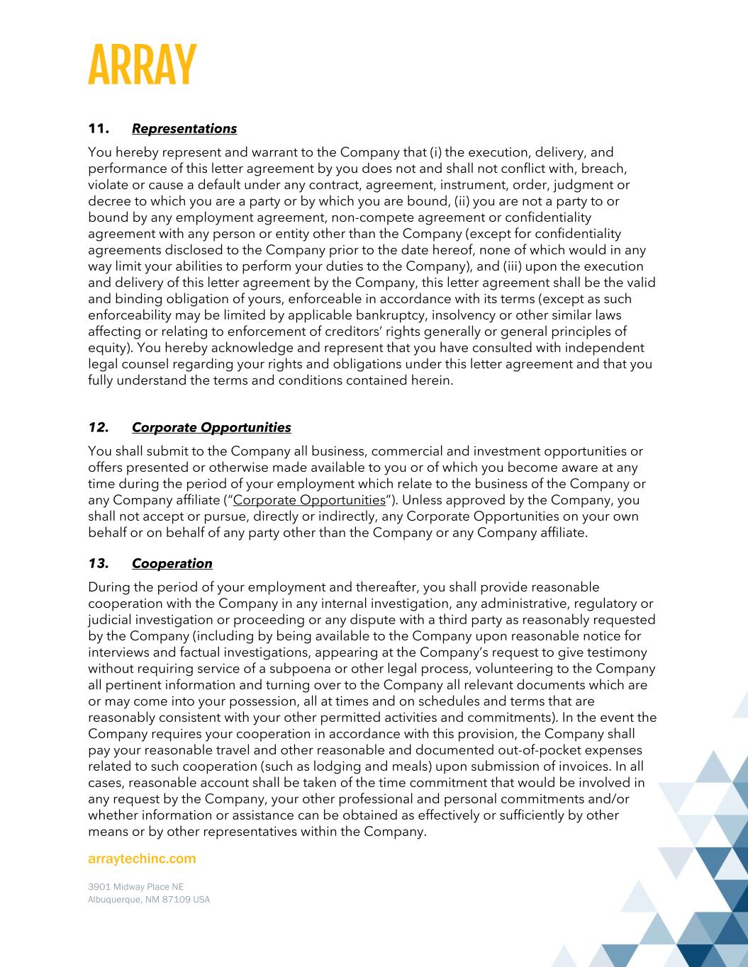 arraytechinc.com 3901 Midway Place NE Albuquerque, NM 87109 USA 11. Representations You hereby represent and warrant to the Company that (i) the execution, delivery, and performance of this letter agreement by you does not and shall not conflict with, breach, violate or cause a default under any contract, agreement, instrument, order, judgment or decree to which you are a party or by which you are bound, (ii) you are not a party to or bound by any employment agreement, non-compete agreement or confidentiality agreement with any person or entity other than the Company (except for confidentiality agreements disclosed to the Company prior to the date hereof, none of which would in any way limit your abilities to perform your duties to the Company), and (iii) upon the execution and delivery of this letter agreement by the Company, this letter agreement shall be the valid and binding obligation of yours, enforceable in accordance with its terms (except as such enforceability may be limited by applicable bankruptcy, insolvency or other similar laws affecting or relating to enforcement of creditors’ rights generally or general principles of equity). You hereby acknowledge and represent that you have consulted with independent legal counsel regarding your rights and obligations under this letter agreement and that you fully understand the terms and conditions contained herein. 12. Corporate Opportunities You shall submit to the Company all business, commercial and investment opportunities or offers presented or otherwise made available to you or of which you become aware at any time during the period of your employment which relate to the business of the Company or any Company affiliate (“Corporate Opportunities”). Unless approved by the Company, you shall not accept or pursue, directly or indirectly, any Corporate Opportunities on your own behalf or on behalf of any party other than the Company or any Company affiliate. 13. Cooperation During the period of your employment and thereafter, you shall provide reasonable cooperation with the Company in any internal investigation, any administrative, regulatory or judicial investigation or proceeding or any dispute with a third party as reasonably requested by the Company (including by being available to the Company upon reasonable notice for interviews and factual investigations, appearing at the Company’s request to give testimony without requiring service of a subpoena or other legal process, volunteering to the Company all pertinent information and turning over to the Company all relevant documents which are or may come into your possession, all at times and on schedules and terms that are reasonably consistent with your other permitted activities and commitments). In the event the Company requires your cooperation in accordance with this provision, the Company shall pay your reasonable travel and other reasonable and documented out-of-pocket expenses related to such cooperation (such as lodging and meals) upon submission of invoices. In all cases, reasonable account shall be taken of the time commitment that would be involved in any request by the Company, your other professional and personal commitments and/or whether information or assistance can be obtained as effectively or sufficiently by other means or by other representatives within the Company.