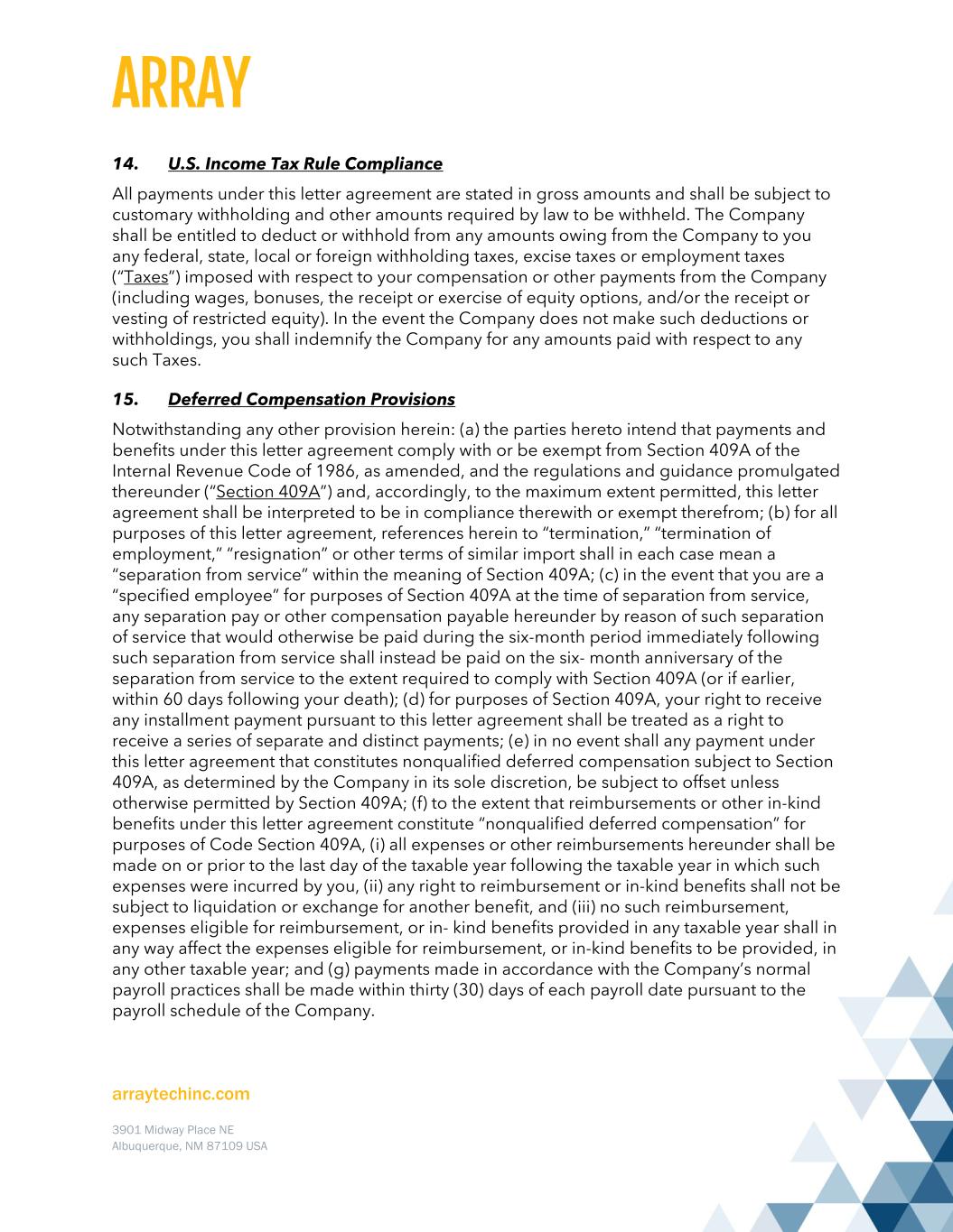arraytechinc.com 3901 Midway Place NE Albuquerque, NM 87109 USA 14. U.S. Income Tax Rule Compliance All payments under this letter agreement are stated in gross amounts and shall be subject to customary withholding and other amounts required by law to be withheld. The Company shall be entitled to deduct or withhold from any amounts owing from the Company to you any federal, state, local or foreign withholding taxes, excise taxes or employment taxes (“Taxes”) imposed with respect to your compensation or other payments from the Company (including wages, bonuses, the receipt or exercise of equity options, and/or the receipt or vesting of restricted equity). In the event the Company does not make such deductions or withholdings, you shall indemnify the Company for any amounts paid with respect to any such Taxes. 15. Deferred Compensation Provisions Notwithstanding any other provision herein: (a) the parties hereto intend that payments and benefits under this letter agreement comply with or be exempt from Section 409A of the Internal Revenue Code of 1986, as amended, and the regulations and guidance promulgated thereunder (“Section 409A”) and, accordingly, to the maximum extent permitted, this letter agreement shall be interpreted to be in compliance therewith or exempt therefrom; (b) for all purposes of this letter agreement, references herein to “termination,” “termination of employment,” “resignation” or other terms of similar import shall in each case mean a “separation from service” within the meaning of Section 409A; (c) in the event that you are a “specified employee” for purposes of Section 409A at the time of separation from service, any separation pay or other compensation payable hereunder by reason of such separation of service that would otherwise be paid during the six-month period immediately following such separation from service shall instead be paid on the six- month anniversary of the separation from service to the extent required to comply with Section 409A (or if earlier, within 60 days following your death); (d) for purposes of Section 409A, your right to receive any installment payment pursuant to this letter agreement shall be treated as a right to receive a series of separate and distinct payments; (e) in no event shall any payment under this letter agreement that constitutes nonqualified deferred compensation subject to Section 409A, as determined by the Company in its sole discretion, be subject to offset unless otherwise permitted by Section 409A; (f) to the extent that reimbursements or other in-kind benefits under this letter agreement constitute “nonqualified deferred compensation” for purposes of Code Section 409A, (i) all expenses or other reimbursements hereunder shall be made on or prior to the last day of the taxable year following the taxable year in which such expenses were incurred by you, (ii) any right to reimbursement or in-kind benefits shall not be subject to liquidation or exchange for another benefit, and (iii) no such reimbursement, expenses eligible for reimbursement, or in- kind benefits provided in any taxable year shall in any way affect the expenses eligible for reimbursement, or in-kind benefits to be provided, in any other taxable year; and (g) payments made in accordance with the Company’s normal payroll practices shall be made within thirty (30) days of each payroll date pursuant to the payroll schedule of the Company.