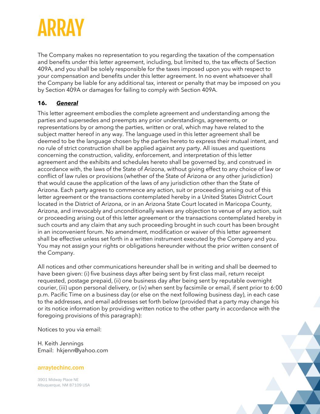 arraytechinc.com 3901 Midway Place NE Albuquerque, NM 87109 USA The Company makes no representation to you regarding the taxation of the compensation and benefits under this letter agreement, including, but limited to, the tax effects of Section 409A, and you shall be solely responsible for the taxes imposed upon you with respect to your compensation and benefits under this letter agreement. In no event whatsoever shall the Company be liable for any additional tax, interest or penalty that may be imposed on you by Section 409A or damages for failing to comply with Section 409A. 16. General This letter agreement embodies the complete agreement and understanding among the parties and supersedes and preempts any prior understandings, agreements, or representations by or among the parties, written or oral, which may have related to the subject matter hereof in any way. The language used in this letter agreement shall be deemed to be the language chosen by the parties hereto to express their mutual intent, and no rule of strict construction shall be applied against any party. All issues and questions concerning the construction, validity, enforcement, and interpretation of this letter agreement and the exhibits and schedules hereto shall be governed by, and construed in accordance with, the laws of the State of Arizona, without giving effect to any choice of law or conflict of law rules or provisions (whether of the State of Arizona or any other jurisdiction) that would cause the application of the laws of any jurisdiction other than the State of Arizona. Each party agrees to commence any action, suit or proceeding arising out of this letter agreement or the transactions contemplated hereby in a United States District Court located in the District of Arizona, or in an Arizona State Court located in Maricopa County, Arizona, and irrevocably and unconditionally waives any objection to venue of any action, suit or proceeding arising out of this letter agreement or the transactions contemplated hereby in such courts and any claim that any such proceeding brought in such court has been brought in an inconvenient forum. No amendment, modification or waiver of this letter agreement shall be effective unless set forth in a written instrument executed by the Company and you. You may not assign your rights or obligations hereunder without the prior written consent of the Company. All notices and other communications hereunder shall be in writing and shall be deemed to have been given: (i) five business days after being sent by first class mail, return receipt requested, postage prepaid, (ii) one business day after being sent by reputable overnight courier, (iii) upon personal delivery, or (iv) when sent by facsimile or email, if sent prior to 6:00 p.m. Pacific Time on a business day (or else on the next following business day), in each case to the addresses, and email addresses set forth below (provided that a party may change his or its notice information by providing written notice to the other party in accordance with the foregoing provisions of this paragraph): Notices to you via email: H. Keith Jennings Email: hkjenn@yahoo.com