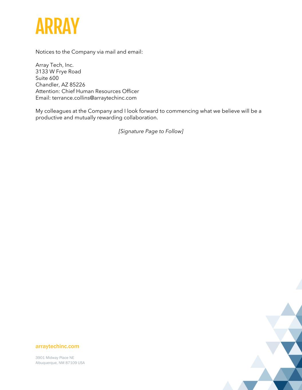 arraytechinc.com 3901 Midway Place NE Albuquerque, NM 87109 USA Notices to the Company via mail and email: Array Tech, Inc. 3133 W Frye Road Suite 600 Chandler, AZ 85226 Attention: Chief Human Resources Officer Email: terrance.collins@arraytechinc.com My colleagues at the Company and I look forward to commencing what we believe will be a productive and mutually rewarding collaboration. [Signature Page to Follow]