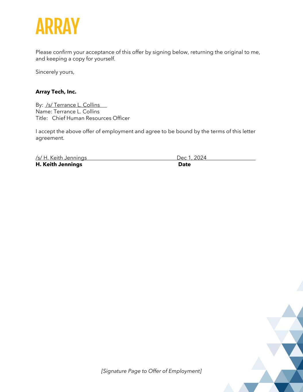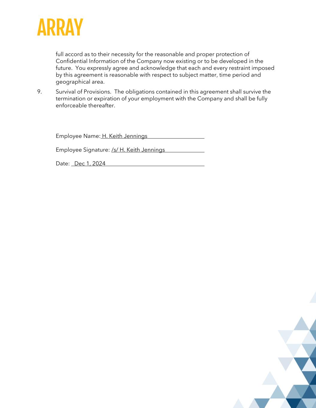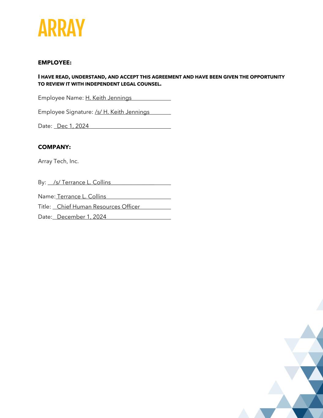 EMPLOYEE: I HAVE READ, UNDERSTAND, AND ACCEPT THIS AGREEMENT AND HAVE BEEN GIVEN THE OPPORTUNITY TO REVIEW IT WITH INDEPENDENT LEGAL COUNSEL. Employee Name: H. Keith Jennings Employee Signature: /s/ H. Keith Jennings Date: Dec 1, 2024 COMPANY: Array Tech, Inc. By: __/s/ Terrance L. Collins_______________ Name: Terrance L. Collins Title: Chief Human Resources Officer Date: December 1, 2024