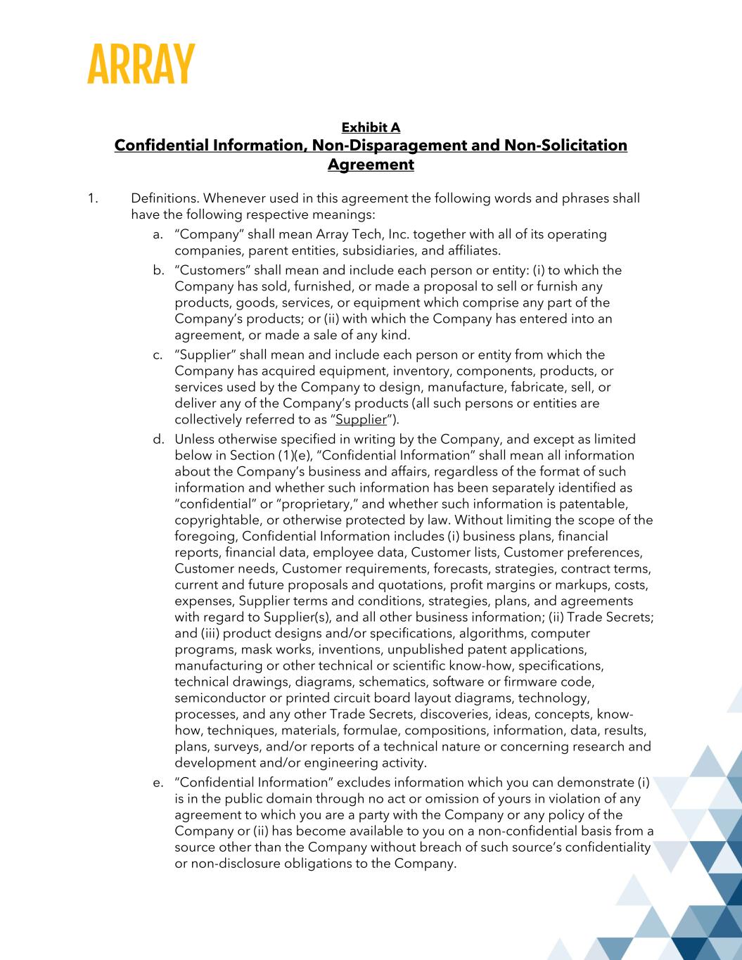 Exhibit A Confidential Information, Non-Disparagement and Non-Solicitation Agreement 1. Definitions. Whenever used in this agreement the following words and phrases shall have the following respective meanings: a. “Company” shall mean Array Tech, Inc. together with all of its operating companies, parent entities, subsidiaries, and affiliates. b. “Customers” shall mean and include each person or entity: (i) to which the Company has sold, furnished, or made a proposal to sell or furnish any products, goods, services, or equipment which comprise any part of the Company’s products; or (ii) with which the Company has entered into an agreement, or made a sale of any kind. c. “Supplier” shall mean and include each person or entity from which the Company has acquired equipment, inventory, components, products, or services used by the Company to design, manufacture, fabricate, sell, or deliver any of the Company’s products (all such persons or entities are collectively referred to as “Supplier”). d. Unless otherwise specified in writing by the Company, and except as limited below in Section (1)(e), “Confidential Information” shall mean all information about the Company’s business and affairs, regardless of the format of such information and whether such information has been separately identified as “confidential” or “proprietary,” and whether such information is patentable, copyrightable, or otherwise protected by law. Without limiting the scope of the foregoing, Confidential Information includes (i) business plans, financial reports, financial data, employee data, Customer lists, Customer preferences, Customer needs, Customer requirements, forecasts, strategies, contract terms, current and future proposals and quotations, profit margins or markups, costs, expenses, Supplier terms and conditions, strategies, plans, and agreements with regard to Supplier(s), and all other business information; (ii) Trade Secrets; and (iii) product designs and/or specifications, algorithms, computer programs, mask works, inventions, unpublished patent applications, manufacturing or other technical or scientific know-how, specifications, technical drawings, diagrams, schematics, software or firmware code, semiconductor or printed circuit board layout diagrams, technology, processes, and any other Trade Secrets, discoveries, ideas, concepts, know- how, techniques, materials, formulae, compositions, information, data, results, plans, surveys, and/or reports of a technical nature or concerning research and development and/or engineering activity. e. “Confidential Information” excludes information which you can demonstrate (i) is in the public domain through no act or omission of yours in violation of any agreement to which you are a party with the Company or any policy of the Company or (ii) has become available to you on a non-confidential basis from a source other than the Company without breach of such source’s confidentiality or non-disclosure obligations to the Company.