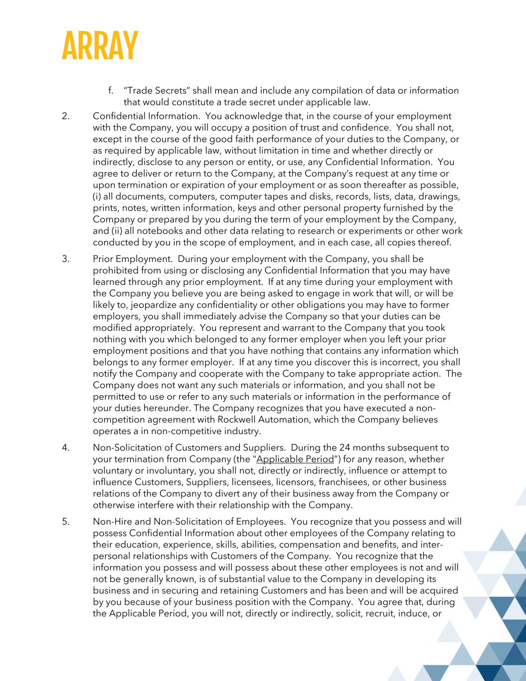 f. “Trade Secrets” shall mean and include any compilation of data or information that would constitute a trade secret under applicable law. 2. Confidential Information. You acknowledge that, in the course of your employment with the Company, you will occupy a position of trust and confidence. You shall not, except in the course of the good faith performance of your duties to the Company, or as required by applicable law, without limitation in time and whether directly or indirectly, disclose to any person or entity, or use, any Confidential Information. You agree to deliver or return to the Company, at the Company’s request at any time or upon termination or expiration of your employment or as soon thereafter as possible, (i) all documents, computers, computer tapes and disks, records, lists, data, drawings, prints, notes, written information, keys and other personal property furnished by the Company or prepared by you during the term of your employment by the Company, and (ii) all notebooks and other data relating to research or experiments or other work conducted by you in the scope of employment, and in each case, all copies thereof. 3. Prior Employment. During your employment with the Company, you shall be prohibited from using or disclosing any Confidential Information that you may have learned through any prior employment. If at any time during your employment with the Company you believe you are being asked to engage in work that will, or will be likely to, jeopardize any confidentiality or other obligations you may have to former employers, you shall immediately advise the Company so that your duties can be modified appropriately. You represent and warrant to the Company that you took nothing with you which belonged to any former employer when you left your prior employment positions and that you have nothing that contains any information which belongs to any former employer. If at any time you discover this is incorrect, you shall notify the Company and cooperate with the Company to take appropriate action. The Company does not want any such materials or information, and you shall not be permitted to use or refer to any such materials or information in the performance of your duties hereunder. The Company recognizes that you have executed a non- competition agreement with Rockwell Automation, which the Company believes operates a in non-competitive industry. 4. Non-Solicitation of Customers and Suppliers. During the 24 months subsequent to your termination from Company (the “Applicable Period”) for any reason, whether voluntary or involuntary, you shall not, directly or indirectly, influence or attempt to influence Customers, Suppliers, licensees, licensors, franchisees, or other business relations of the Company to divert any of their business away from the Company or otherwise interfere with their relationship with the Company. 5. Non-Hire and Non-Solicitation of Employees. You recognize that you possess and will possess Confidential Information about other employees of the Company relating to their education, experience, skills, abilities, compensation and benefits, and inter- personal relationships with Customers of the Company. You recognize that the information you possess and will possess about these other employees is not and will not be generally known, is of substantial value to the Company in developing its business and in securing and retaining Customers and has been and will be acquired by you because of your business position with the Company. You agree that, during the Applicable Period, you will not, directly or indirectly, solicit, recruit, induce, or