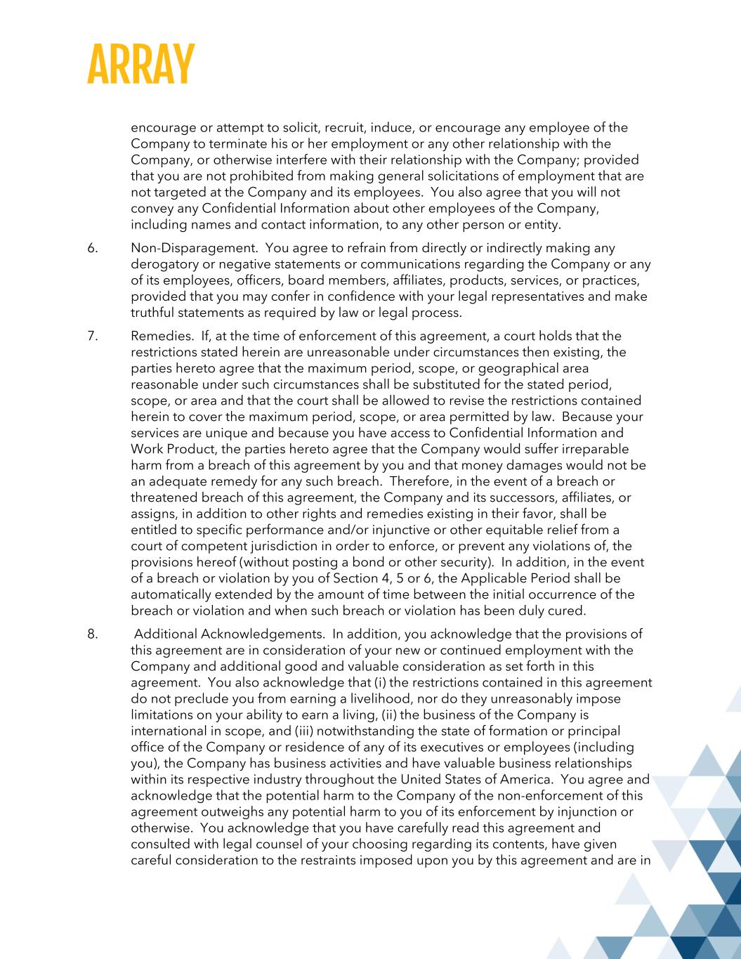 encourage or attempt to solicit, recruit, induce, or encourage any employee of the Company to terminate his or her employment or any other relationship with the Company, or otherwise interfere with their relationship with the Company; provided that you are not prohibited from making general solicitations of employment that are not targeted at the Company and its employees. You also agree that you will not convey any Confidential Information about other employees of the Company, including names and contact information, to any other person or entity. 6. Non-Disparagement. You agree to refrain from directly or indirectly making any derogatory or negative statements or communications regarding the Company or any of its employees, officers, board members, affiliates, products, services, or practices, provided that you may confer in confidence with your legal representatives and make truthful statements as required by law or legal process. 7. Remedies. If, at the time of enforcement of this agreement, a court holds that the restrictions stated herein are unreasonable under circumstances then existing, the parties hereto agree that the maximum period, scope, or geographical area reasonable under such circumstances shall be substituted for the stated period, scope, or area and that the court shall be allowed to revise the restrictions contained herein to cover the maximum period, scope, or area permitted by law. Because your services are unique and because you have access to Confidential Information and Work Product, the parties hereto agree that the Company would suffer irreparable harm from a breach of this agreement by you and that money damages would not be an adequate remedy for any such breach. Therefore, in the event of a breach or threatened breach of this agreement, the Company and its successors, affiliates, or assigns, in addition to other rights and remedies existing in their favor, shall be entitled to specific performance and/or injunctive or other equitable relief from a court of competent jurisdiction in order to enforce, or prevent any violations of, the provisions hereof (without posting a bond or other security). In addition, in the event of a breach or violation by you of Section 4, 5 or 6, the Applicable Period shall be automatically extended by the amount of time between the initial occurrence of the breach or violation and when such breach or violation has been duly cured. 8. Additional Acknowledgements. In addition, you acknowledge that the provisions of this agreement are in consideration of your new or continued employment with the Company and additional good and valuable consideration as set forth in this agreement. You also acknowledge that (i) the restrictions contained in this agreement do not preclude you from earning a livelihood, nor do they unreasonably impose limitations on your ability to earn a living, (ii) the business of the Company is international in scope, and (iii) notwithstanding the state of formation or principal office of the Company or residence of any of its executives or employees (including you), the Company has business activities and have valuable business relationships within its respective industry throughout the United States of America. You agree and acknowledge that the potential harm to the Company of the non-enforcement of this agreement outweighs any potential harm to you of its enforcement by injunction or otherwise. You acknowledge that you have carefully read this agreement and consulted with legal counsel of your choosing regarding its contents, have given careful consideration to the restraints imposed upon you by this agreement and are in