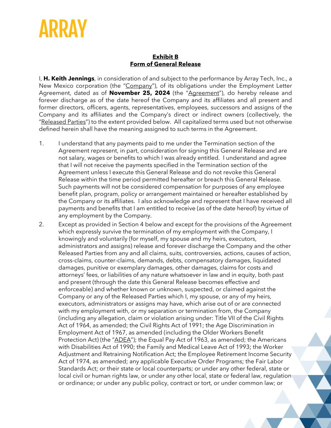 Exhibit B Form of General Release I, H. Keith Jennings, in consideration of and subject to the performance by Array Tech, Inc., a New Mexico corporation (the “Company”), of its obligations under the Employment Letter Agreement, dated as of November 25, 2024 (the “Agreement”), do hereby release and forever discharge as of the date hereof the Company and its affiliates and all present and former directors, officers, agents, representatives, employees, successors and assigns of the Company and its affiliates and the Company’s direct or indirect owners (collectively, the “Released Parties”) to the extent provided below. All capitalized terms used but not otherwise defined herein shall have the meaning assigned to such terms in the Agreement. 1. I understand that any payments paid to me under the Termination section of the Agreement represent, in part, consideration for signing this General Release and are not salary, wages or benefits to which I was already entitled. I understand and agree that I will not receive the payments specified in the Termination section of the Agreement unless I execute this General Release and do not revoke this General Release within the time period permitted hereafter or breach this General Release. Such payments will not be considered compensation for purposes of any employee benefit plan, program, policy or arrangement maintained or hereafter established by the Company or its affiliates. I also acknowledge and represent that I have received all payments and benefits that I am entitled to receive (as of the date hereof) by virtue of any employment by the Company. 2. Except as provided in Section 4 below and except for the provisions of the Agreement which expressly survive the termination of my employment with the Company, I knowingly and voluntarily (for myself, my spouse and my heirs, executors, administrators and assigns) release and forever discharge the Company and the other Released Parties from any and all claims, suits, controversies, actions, causes of action, cross-claims, counter-claims, demands, debts, compensatory damages, liquidated damages, punitive or exemplary damages, other damages, claims for costs and attorneys’ fees, or liabilities of any nature whatsoever in law and in equity, both past and present (through the date this General Release becomes effective and enforceable) and whether known or unknown, suspected, or claimed against the Company or any of the Released Parties which I, my spouse, or any of my heirs, executors, administrators or assigns may have, which arise out of or are connected with my employment with, or my separation or termination from, the Company (including any allegation, claim or violation arising under: Title VII of the Civil Rights Act of 1964, as amended; the Civil Rights Act of 1991; the Age Discrimination in Employment Act of 1967, as amended (including the Older Workers Benefit Protection Act) (the “ADEA”); the Equal Pay Act of 1963, as amended; the Americans with Disabilities Act of 1990; the Family and Medical Leave Act of 1993; the Worker Adjustment and Retraining Notification Act; the Employee Retirement Income Security Act of 1974, as amended; any applicable Executive Order Programs; the Fair Labor Standards Act; or their state or local counterparts; or under any other federal, state or local civil or human rights law, or under any other local, state or federal law, regulation or ordinance; or under any public policy, contract or tort, or under common law; or