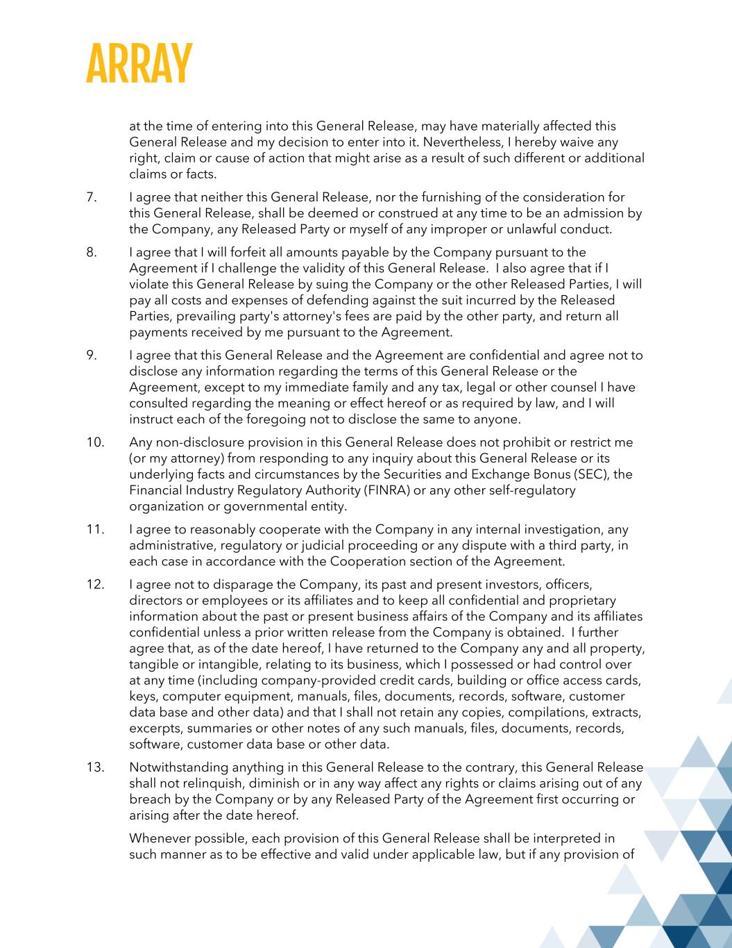 at the time of entering into this General Release, may have materially affected this General Release and my decision to enter into it. Nevertheless, I hereby waive any right, claim or cause of action that might arise as a result of such different or additional claims or facts. 7. I agree that neither this General Release, nor the furnishing of the consideration for this General Release, shall be deemed or construed at any time to be an admission by the Company, any Released Party or myself of any improper or unlawful conduct. 8. I agree that I will forfeit all amounts payable by the Company pursuant to the Agreement if I challenge the validity of this General Release. I also agree that if I violate this General Release by suing the Company or the other Released Parties, I will pay all costs and expenses of defending against the suit incurred by the Released Parties, prevailing party's attorney's fees are paid by the other party, and return all payments received by me pursuant to the Agreement. 9. I agree that this General Release and the Agreement are confidential and agree not to disclose any information regarding the terms of this General Release or the Agreement, except to my immediate family and any tax, legal or other counsel I have consulted regarding the meaning or effect hereof or as required by law, and I will instruct each of the foregoing not to disclose the same to anyone. 10. Any non-disclosure provision in this General Release does not prohibit or restrict me (or my attorney) from responding to any inquiry about this General Release or its underlying facts and circumstances by the Securities and Exchange Bonus (SEC), the Financial Industry Regulatory Authority (FINRA) or any other self-regulatory organization or governmental entity. 11. I agree to reasonably cooperate with the Company in any internal investigation, any administrative, regulatory or judicial proceeding or any dispute with a third party, in each case in accordance with the Cooperation section of the Agreement. 12. I agree not to disparage the Company, its past and present investors, officers, directors or employees or its affiliates and to keep all confidential and proprietary information about the past or present business affairs of the Company and its affiliates confidential unless a prior written release from the Company is obtained. I further agree that, as of the date hereof, I have returned to the Company any and all property, tangible or intangible, relating to its business, which I possessed or had control over at any time (including company-provided credit cards, building or office access cards, keys, computer equipment, manuals, files, documents, records, software, customer data base and other data) and that I shall not retain any copies, compilations, extracts, excerpts, summaries or other notes of any such manuals, files, documents, records, software, customer data base or other data. 13. Notwithstanding anything in this General Release to the contrary, this General Release shall not relinquish, diminish or in any way affect any rights or claims arising out of any breach by the Company or by any Released Party of the Agreement first occurring or arising after the date hereof. Whenever possible, each provision of this General Release shall be interpreted in such manner as to be effective and valid under applicable law, but if any provision of