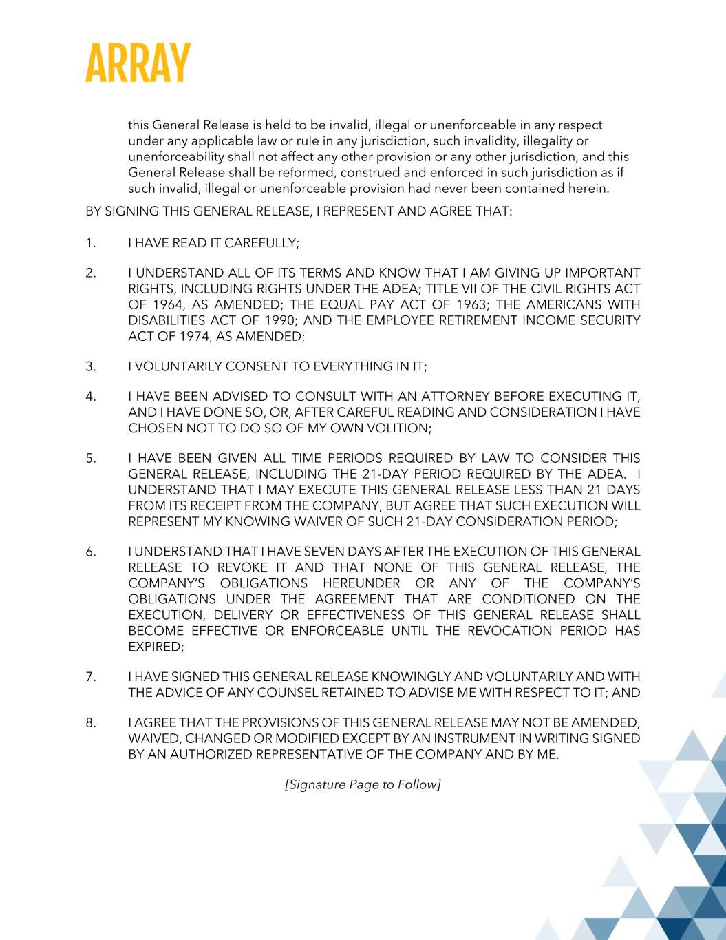 this General Release is held to be invalid, illegal or unenforceable in any respect under any applicable law or rule in any jurisdiction, such invalidity, illegality or unenforceability shall not affect any other provision or any other jurisdiction, and this General Release shall be reformed, construed and enforced in such jurisdiction as if such invalid, illegal or unenforceable provision had never been contained herein. BY SIGNING THIS GENERAL RELEASE, I REPRESENT AND AGREE THAT: 1. I HAVE READ IT CAREFULLY; 2. I UNDERSTAND ALL OF ITS TERMS AND KNOW THAT I AM GIVING UP IMPORTANT RIGHTS, INCLUDING RIGHTS UNDER THE ADEA; TITLE VII OF THE CIVIL RIGHTS ACT OF 1964, AS AMENDED; THE EQUAL PAY ACT OF 1963; THE AMERICANS WITH DISABILITIES ACT OF 1990; AND THE EMPLOYEE RETIREMENT INCOME SECURITY ACT OF 1974, AS AMENDED; 3. I VOLUNTARILY CONSENT TO EVERYTHING IN IT; 4. I HAVE BEEN ADVISED TO CONSULT WITH AN ATTORNEY BEFORE EXECUTING IT, AND I HAVE DONE SO, OR, AFTER CAREFUL READING AND CONSIDERATION I HAVE CHOSEN NOT TO DO SO OF MY OWN VOLITION; 5. I HAVE BEEN GIVEN ALL TIME PERIODS REQUIRED BY LAW TO CONSIDER THIS GENERAL RELEASE, INCLUDING THE 21-DAY PERIOD REQUIRED BY THE ADEA. I UNDERSTAND THAT I MAY EXECUTE THIS GENERAL RELEASE LESS THAN 21 DAYS FROM ITS RECEIPT FROM THE COMPANY, BUT AGREE THAT SUCH EXECUTION WILL REPRESENT MY KNOWING WAIVER OF SUCH 21-DAY CONSIDERATION PERIOD; 6. I UNDERSTAND THAT I HAVE SEVEN DAYS AFTER THE EXECUTION OF THIS GENERAL RELEASE TO REVOKE IT AND THAT NONE OF THIS GENERAL RELEASE, THE COMPANY’S OBLIGATIONS HEREUNDER OR ANY OF THE COMPANY’S OBLIGATIONS UNDER THE AGREEMENT THAT ARE CONDITIONED ON THE EXECUTION, DELIVERY OR EFFECTIVENESS OF THIS GENERAL RELEASE SHALL BECOME EFFECTIVE OR ENFORCEABLE UNTIL THE REVOCATION PERIOD HAS EXPIRED; 7. I HAVE SIGNED THIS GENERAL RELEASE KNOWINGLY AND VOLUNTARILY AND WITH THE ADVICE OF ANY COUNSEL RETAINED TO ADVISE ME WITH RESPECT TO IT; AND 8. I AGREE THAT THE PROVISIONS OF THIS GENERAL RELEASE MAY NOT BE AMENDED, WAIVED, CHANGED OR MODIFIED EXCEPT BY AN INSTRUMENT IN WRITING SIGNED BY AN AUTHORIZED REPRESENTATIVE OF THE COMPANY AND BY ME. [Signature Page to Follow]