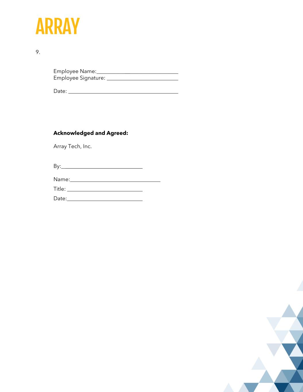 9. Employee Name: __ Employee Signature: Date: Acknowledged and Agreed: Array Tech, Inc. By:_ ____________________________ Name: Title: Date: