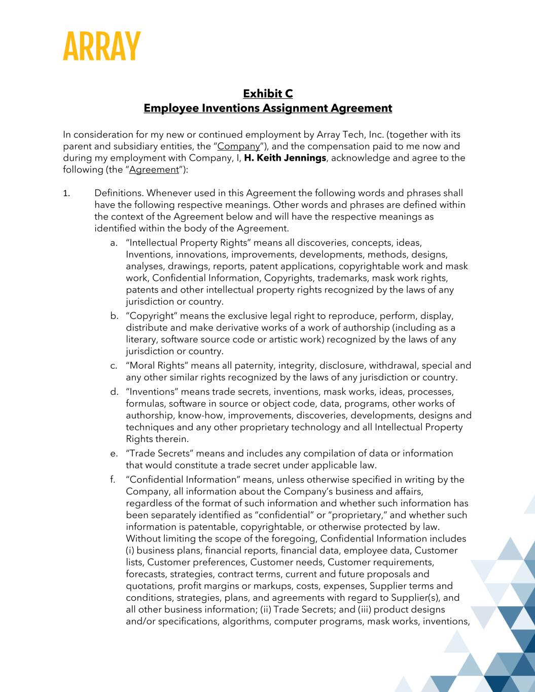 Exhibit C Employee Inventions Assignment Agreement In consideration for my new or continued employment by Array Tech, Inc. (together with its parent and subsidiary entities, the “Company”), and the compensation paid to me now and during my employment with Company, I, H. Keith Jennings, acknowledge and agree to the following (the “Agreement”): 1. Definitions. Whenever used in this Agreement the following words and phrases shall have the following respective meanings. Other words and phrases are defined within the context of the Agreement below and will have the respective meanings as identified within the body of the Agreement. a. “Intellectual Property Rights” means all discoveries, concepts, ideas, Inventions, innovations, improvements, developments, methods, designs, analyses, drawings, reports, patent applications, copyrightable work and mask work, Confidential Information, Copyrights, trademarks, mask work rights, patents and other intellectual property rights recognized by the laws of any jurisdiction or country. b. “Copyright” means the exclusive legal right to reproduce, perform, display, distribute and make derivative works of a work of authorship (including as a literary, software source code or artistic work) recognized by the laws of any jurisdiction or country. c. “Moral Rights” means all paternity, integrity, disclosure, withdrawal, special and any other similar rights recognized by the laws of any jurisdiction or country. d. “Inventions” means trade secrets, inventions, mask works, ideas, processes, formulas, software in source or object code, data, programs, other works of authorship, know-how, improvements, discoveries, developments, designs and techniques and any other proprietary technology and all Intellectual Property Rights therein. e. “Trade Secrets” means and includes any compilation of data or information that would constitute a trade secret under applicable law. f. “Confidential Information” means, unless otherwise specified in writing by the Company, all information about the Company’s business and affairs, regardless of the format of such information and whether such information has been separately identified as “confidential” or “proprietary,” and whether such information is patentable, copyrightable, or otherwise protected by law. Without limiting the scope of the foregoing, Confidential Information includes (i) business plans, financial reports, financial data, employee data, Customer lists, Customer preferences, Customer needs, Customer requirements, forecasts, strategies, contract terms, current and future proposals and quotations, profit margins or markups, costs, expenses, Supplier terms and conditions, strategies, plans, and agreements with regard to Supplier(s), and all other business information; (ii) Trade Secrets; and (iii) product designs and/or specifications, algorithms, computer programs, mask works, inventions,