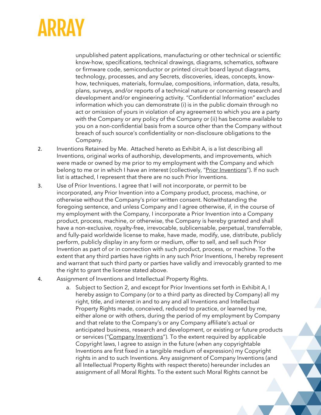unpublished patent applications, manufacturing or other technical or scientific know-how, specifications, technical drawings, diagrams, schematics, software or firmware code, semiconductor or printed circuit board layout diagrams, technology, processes, and any Secrets, discoveries, ideas, concepts, know- how, techniques, materials, formulae, compositions, information, data, results, plans, surveys, and/or reports of a technical nature or concerning research and development and/or engineering activity. “Confidential Information” excludes information which you can demonstrate (i) is in the public domain through no act or omission of yours in violation of any agreement to which you are a party with the Company or any policy of the Company or (ii) has become available to you on a non-confidential basis from a source other than the Company without breach of such source’s confidentiality or non-disclosure obligations to the Company. 2. Inventions Retained by Me. Attached hereto as Exhibit A, is a list describing all Inventions, original works of authorship, developments, and improvements, which were made or owned by me prior to my employment with the Company and which belong to me or in which I have an interest (collectively, “Prior Inventions”). If no such list is attached, I represent that there are no such Prior Inventions. 3. Use of Prior Inventions. I agree that I will not incorporate, or permit to be incorporated, any Prior Invention into a Company product, process, machine, or otherwise without the Company’s prior written consent. Notwithstanding the foregoing sentence, and unless Company and I agree otherwise, if, in the course of my employment with the Company, I incorporate a Prior Invention into a Company product, process, machine, or otherwise, the Company is hereby granted and shall have a non-exclusive, royalty-free, irrevocable, sublicensable, perpetual, transferrable, and fully-paid worldwide license to make, have made, modify, use, distribute, publicly perform, publicly display in any form or medium, offer to sell, and sell such Prior Invention as part of or in connection with such product, process, or machine. To the extent that any third parties have rights in any such Prior Inventions, I hereby represent and warrant that such third party or parties have validly and irrevocably granted to me the right to grant the license stated above. 4. Assignment of Inventions and Intellectual Property Rights. a. Subject to Section 2, and except for Prior Inventions set forth in Exhibit A, I hereby assign to Company (or to a third party as directed by Company) all my right, title, and interest in and to any and all Inventions and Intellectual Property Rights made, conceived, reduced to practice, or learned by me, either alone or with others, during the period of my employment by Company and that relate to the Company’s or any Company affiliate’s actual or anticipated business, research and development, or existing or future products or services (“Company Inventions”). To the extent required by applicable Copyright laws, I agree to assign in the future (when any copyrightable Inventions are first fixed in a tangible medium of expression) my Copyright rights in and to such Inventions. Any assignment of Company Inventions (and all Intellectual Property Rights with respect thereto) hereunder includes an assignment of all Moral Rights. To the extent such Moral Rights cannot be