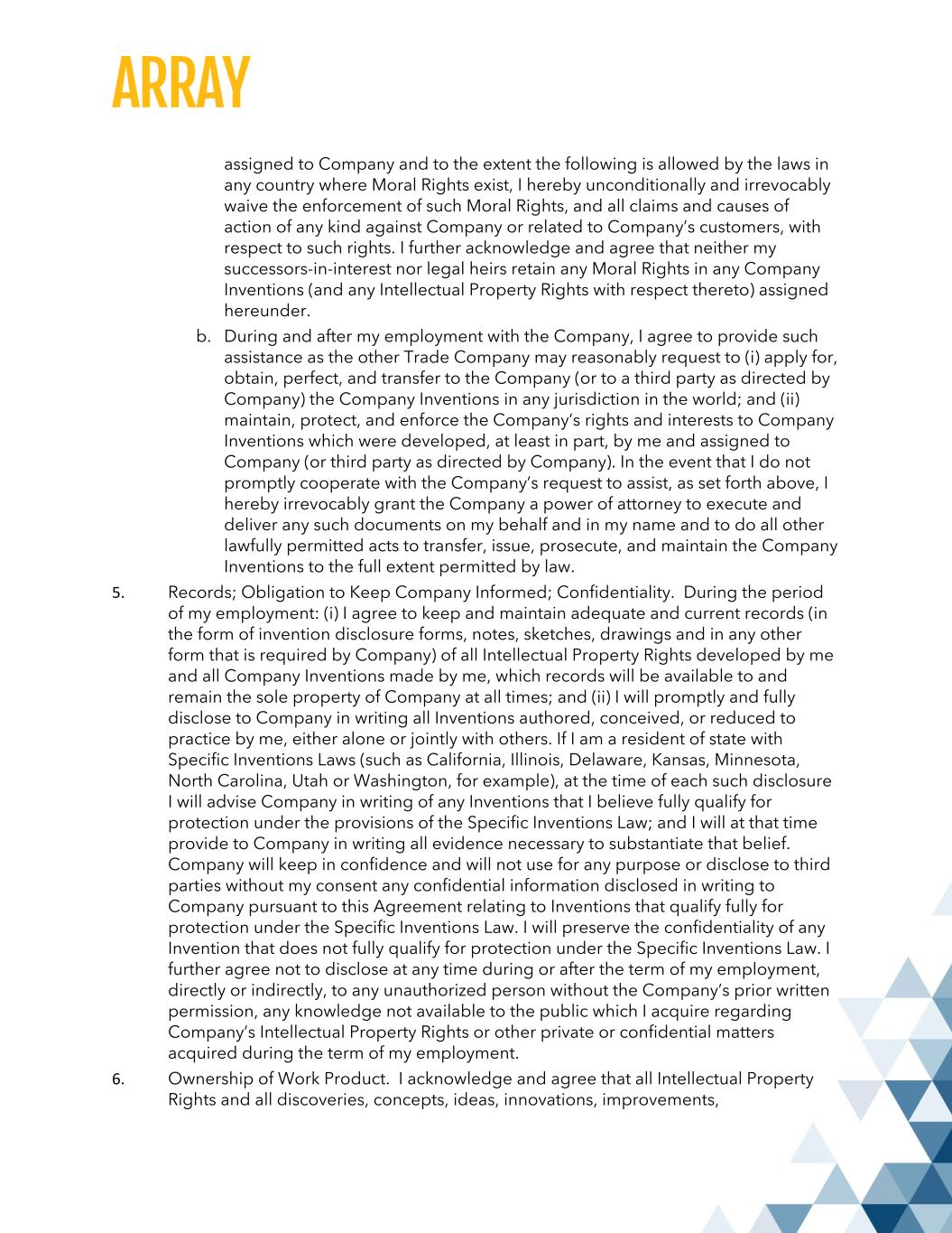 assigned to Company and to the extent the following is allowed by the laws in any country where Moral Rights exist, I hereby unconditionally and irrevocably waive the enforcement of such Moral Rights, and all claims and causes of action of any kind against Company or related to Company’s customers, with respect to such rights. I further acknowledge and agree that neither my successors-in-interest nor legal heirs retain any Moral Rights in any Company Inventions (and any Intellectual Property Rights with respect thereto) assigned hereunder. b. During and after my employment with the Company, I agree to provide such assistance as the other Trade Company may reasonably request to (i) apply for, obtain, perfect, and transfer to the Company (or to a third party as directed by Company) the Company Inventions in any jurisdiction in the world; and (ii) maintain, protect, and enforce the Company’s rights and interests to Company Inventions which were developed, at least in part, by me and assigned to Company (or third party as directed by Company). In the event that I do not promptly cooperate with the Company’s request to assist, as set forth above, I hereby irrevocably grant the Company a power of attorney to execute and deliver any such documents on my behalf and in my name and to do all other lawfully permitted acts to transfer, issue, prosecute, and maintain the Company Inventions to the full extent permitted by law. 5. Records; Obligation to Keep Company Informed; Confidentiality. During the period of my employment: (i) I agree to keep and maintain adequate and current records (in the form of invention disclosure forms, notes, sketches, drawings and in any other form that is required by Company) of all Intellectual Property Rights developed by me and all Company Inventions made by me, which records will be available to and remain the sole property of Company at all times; and (ii) I will promptly and fully disclose to Company in writing all Inventions authored, conceived, or reduced to practice by me, either alone or jointly with others. If I am a resident of state with Specific Inventions Laws (such as California, Illinois, Delaware, Kansas, Minnesota, North Carolina, Utah or Washington, for example), at the time of each such disclosure I will advise Company in writing of any Inventions that I believe fully qualify for protection under the provisions of the Specific Inventions Law; and I will at that time provide to Company in writing all evidence necessary to substantiate that belief. Company will keep in confidence and will not use for any purpose or disclose to third parties without my consent any confidential information disclosed in writing to Company pursuant to this Agreement relating to Inventions that qualify fully for protection under the Specific Inventions Law. I will preserve the confidentiality of any Invention that does not fully qualify for protection under the Specific Inventions Law. I further agree not to disclose at any time during or after the term of my employment, directly or indirectly, to any unauthorized person without the Company’s prior written permission, any knowledge not available to the public which I acquire regarding Company’s Intellectual Property Rights or other private or confidential matters acquired during the term of my employment. 6. Ownership of Work Product. I acknowledge and agree that all Intellectual Property Rights and all discoveries, concepts, ideas, innovations, improvements,