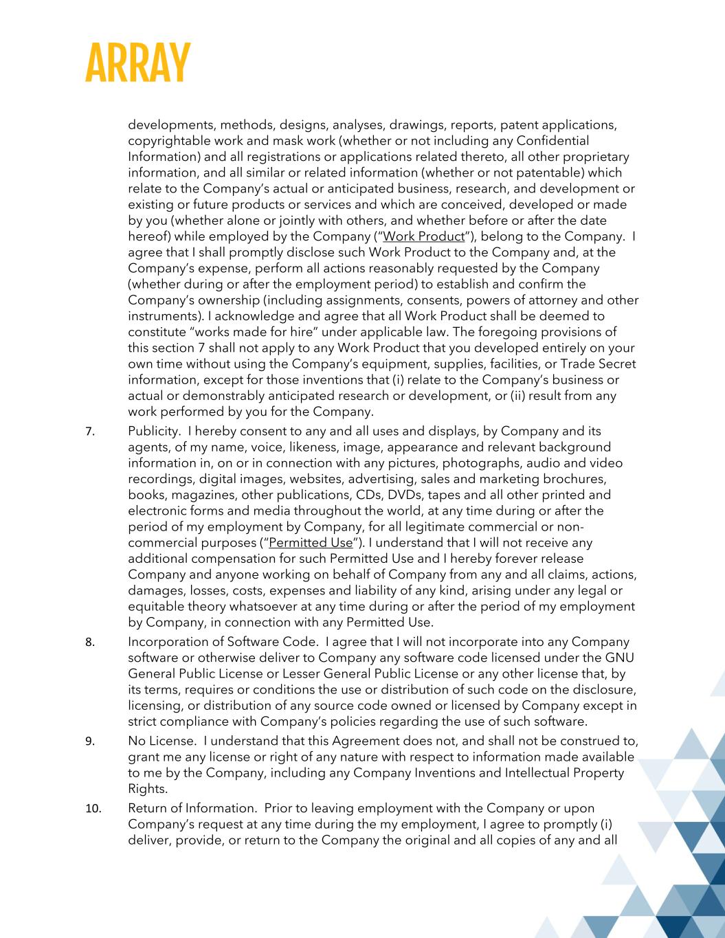 developments, methods, designs, analyses, drawings, reports, patent applications, copyrightable work and mask work (whether or not including any Confidential Information) and all registrations or applications related thereto, all other proprietary information, and all similar or related information (whether or not patentable) which relate to the Company’s actual or anticipated business, research, and development or existing or future products or services and which are conceived, developed or made by you (whether alone or jointly with others, and whether before or after the date hereof) while employed by the Company (“Work Product”), belong to the Company. I agree that I shall promptly disclose such Work Product to the Company and, at the Company’s expense, perform all actions reasonably requested by the Company (whether during or after the employment period) to establish and confirm the Company’s ownership (including assignments, consents, powers of attorney and other instruments). I acknowledge and agree that all Work Product shall be deemed to constitute “works made for hire” under applicable law. The foregoing provisions of this section 7 shall not apply to any Work Product that you developed entirely on your own time without using the Company’s equipment, supplies, facilities, or Trade Secret information, except for those inventions that (i) relate to the Company’s business or actual or demonstrably anticipated research or development, or (ii) result from any work performed by you for the Company. 7. Publicity. I hereby consent to any and all uses and displays, by Company and its agents, of my name, voice, likeness, image, appearance and relevant background information in, on or in connection with any pictures, photographs, audio and video recordings, digital images, websites, advertising, sales and marketing brochures, books, magazines, other publications, CDs, DVDs, tapes and all other printed and electronic forms and media throughout the world, at any time during or after the period of my employment by Company, for all legitimate commercial or non- commercial purposes (“Permitted Use”). I understand that I will not receive any additional compensation for such Permitted Use and I hereby forever release Company and anyone working on behalf of Company from any and all claims, actions, damages, losses, costs, expenses and liability of any kind, arising under any legal or equitable theory whatsoever at any time during or after the period of my employment by Company, in connection with any Permitted Use. 8. Incorporation of Software Code. I agree that I will not incorporate into any Company software or otherwise deliver to Company any software code licensed under the GNU General Public License or Lesser General Public License or any other license that, by its terms, requires or conditions the use or distribution of such code on the disclosure, licensing, or distribution of any source code owned or licensed by Company except in strict compliance with Company’s policies regarding the use of such software. 9. No License. I understand that this Agreement does not, and shall not be construed to, grant me any license or right of any nature with respect to information made available to me by the Company, including any Company Inventions and Intellectual Property Rights. 10. Return of Information. Prior to leaving employment with the Company or upon Company’s request at any time during the my employment, I agree to promptly (i) deliver, provide, or return to the Company the original and all copies of any and all