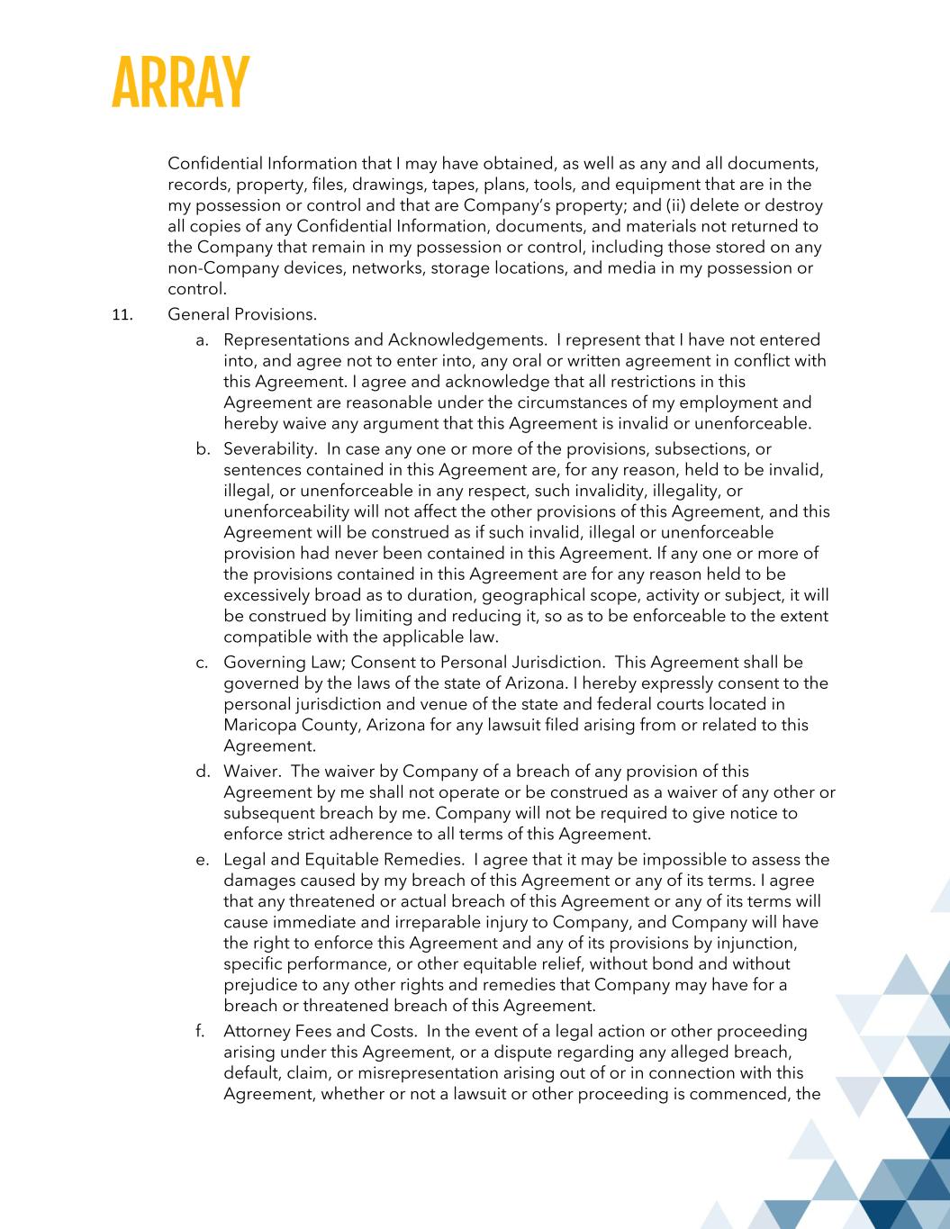Confidential Information that I may have obtained, as well as any and all documents, records, property, files, drawings, tapes, plans, tools, and equipment that are in the my possession or control and that are Company’s property; and (ii) delete or destroy all copies of any Confidential Information, documents, and materials not returned to the Company that remain in my possession or control, including those stored on any non-Company devices, networks, storage locations, and media in my possession or control. 11. General Provisions. a. Representations and Acknowledgements. I represent that I have not entered into, and agree not to enter into, any oral or written agreement in conflict with this Agreement. I agree and acknowledge that all restrictions in this Agreement are reasonable under the circumstances of my employment and hereby waive any argument that this Agreement is invalid or unenforceable. b. Severability. In case any one or more of the provisions, subsections, or sentences contained in this Agreement are, for any reason, held to be invalid, illegal, or unenforceable in any respect, such invalidity, illegality, or unenforceability will not affect the other provisions of this Agreement, and this Agreement will be construed as if such invalid, illegal or unenforceable provision had never been contained in this Agreement. If any one or more of the provisions contained in this Agreement are for any reason held to be excessively broad as to duration, geographical scope, activity or subject, it will be construed by limiting and reducing it, so as to be enforceable to the extent compatible with the applicable law. c. Governing Law; Consent to Personal Jurisdiction. This Agreement shall be governed by the laws of the state of Arizona. I hereby expressly consent to the personal jurisdiction and venue of the state and federal courts located in Maricopa County, Arizona for any lawsuit filed arising from or related to this Agreement. d. Waiver. The waiver by Company of a breach of any provision of this Agreement by me shall not operate or be construed as a waiver of any other or subsequent breach by me. Company will not be required to give notice to enforce strict adherence to all terms of this Agreement. e. Legal and Equitable Remedies. I agree that it may be impossible to assess the damages caused by my breach of this Agreement or any of its terms. I agree that any threatened or actual breach of this Agreement or any of its terms will cause immediate and irreparable injury to Company, and Company will have the right to enforce this Agreement and any of its provisions by injunction, specific performance, or other equitable relief, without bond and without prejudice to any other rights and remedies that Company may have for a breach or threatened breach of this Agreement. f. Attorney Fees and Costs. In the event of a legal action or other proceeding arising under this Agreement, or a dispute regarding any alleged breach, default, claim, or misrepresentation arising out of or in connection with this Agreement, whether or not a lawsuit or other proceeding is commenced, the