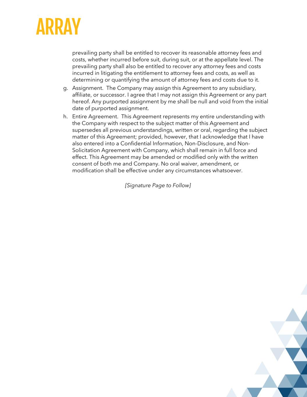 prevailing party shall be entitled to recover its reasonable attorney fees and costs, whether incurred before suit, during suit, or at the appellate level. The prevailing party shall also be entitled to recover any attorney fees and costs incurred in litigating the entitlement to attorney fees and costs, as well as determining or quantifying the amount of attorney fees and costs due to it. g. Assignment. The Company may assign this Agreement to any subsidiary, affiliate, or successor. I agree that I may not assign this Agreement or any part hereof. Any purported assignment by me shall be null and void from the initial date of purported assignment. h. Entire Agreement. This Agreement represents my entire understanding with the Company with respect to the subject matter of this Agreement and supersedes all previous understandings, written or oral, regarding the subject matter of this Agreement; provided, however, that I acknowledge that I have also entered into a Confidential Information, Non-Disclosure, and Non- Solicitation Agreement with Company, which shall remain in full force and effect. This Agreement may be amended or modified only with the written consent of both me and Company. No oral waiver, amendment, or modification shall be effective under any circumstances whatsoever. [Signature Page to Follow]
