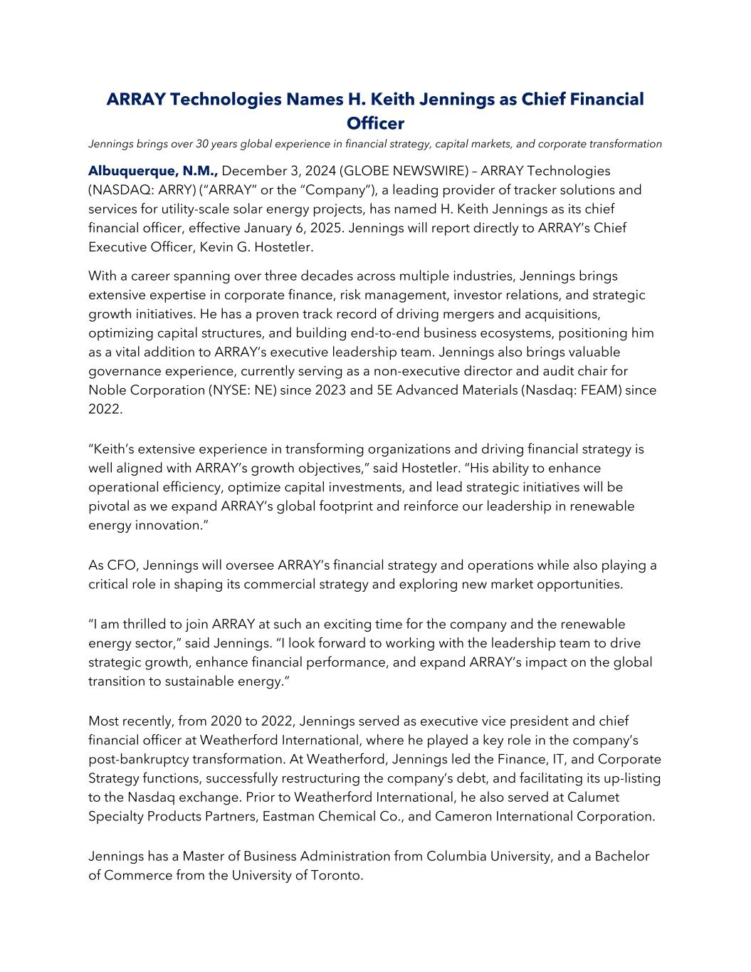 ARRAY Technologies Names H. Keith Jennings as Chief Financial Officer Jennings brings over 30 years global experience in financial strategy, capital markets, and corporate transformation Albuquerque, N.M., December 3, 2024 (GLOBE NEWSWIRE) – ARRAY Technologies (NASDAQ: ARRY) (“ARRAY” or the “Company”), a leading provider of tracker solutions and services for utility-scale solar energy projects, has named H. Keith Jennings as its chief financial officer, effective January 6, 2025. Jennings will report directly to ARRAY’s Chief Executive Officer, Kevin G. Hostetler. With a career spanning over three decades across multiple industries, Jennings brings extensive expertise in corporate finance, risk management, investor relations, and strategic growth initiatives. He has a proven track record of driving mergers and acquisitions, optimizing capital structures, and building end-to-end business ecosystems, positioning him as a vital addition to ARRAY’s executive leadership team. Jennings also brings valuable governance experience, currently serving as a non-executive director and audit chair for Noble Corporation (NYSE: NE) since 2023 and 5E Advanced Materials (Nasdaq: FEAM) since 2022. “Keith’s extensive experience in transforming organizations and driving financial strategy is well aligned with ARRAY’s growth objectives,” said Hostetler. “His ability to enhance operational efficiency, optimize capital investments, and lead strategic initiatives will be pivotal as we expand ARRAY’s global footprint and reinforce our leadership in renewable energy innovation.” As CFO, Jennings will oversee ARRAY’s financial strategy and operations while also playing a critical role in shaping its commercial strategy and exploring new market opportunities. “I am thrilled to join ARRAY at such an exciting time for the company and the renewable energy sector,” said Jennings. “I look forward to working with the leadership team to drive strategic growth, enhance financial performance, and expand ARRAY’s impact on the global transition to sustainable energy.” Most recently, from 2020 to 2022, Jennings served as executive vice president and chief financial officer at Weatherford International, where he played a key role in the company’s post-bankruptcy transformation. At Weatherford, Jennings led the Finance, IT, and Corporate Strategy functions, successfully restructuring the company’s debt, and facilitating its up-listing to the Nasdaq exchange. Prior to Weatherford International, he also served at Calumet Specialty Products Partners, Eastman Chemical Co., and Cameron International Corporation. Jennings has a Master of Business Administration from Columbia University, and a Bachelor of Commerce from the University of Toronto.