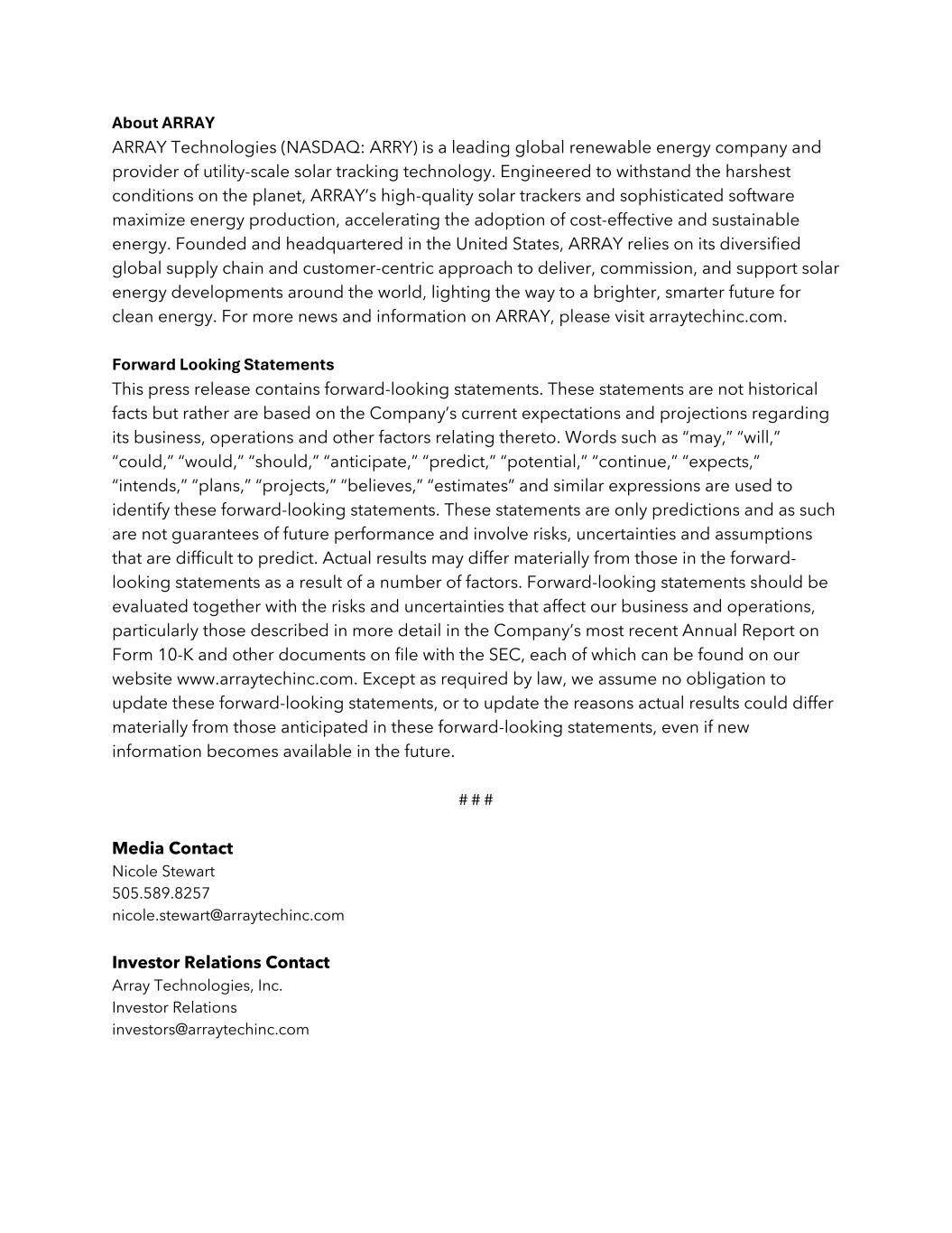 About ARRAY ARRAY Technologies (NASDAQ: ARRY) is a leading global renewable energy company and provider of utility-scale solar tracking technology. Engineered to withstand the harshest conditions on the planet, ARRAY’s high-quality solar trackers and sophisticated software maximize energy production, accelerating the adoption of cost-effective and sustainable energy. Founded and headquartered in the United States, ARRAY relies on its diversified global supply chain and customer-centric approach to deliver, commission, and support solar energy developments around the world, lighting the way to a brighter, smarter future for clean energy. For more news and information on ARRAY, please visit arraytechinc.com. Forward Looking Statements This press release contains forward-looking statements. These statements are not historical facts but rather are based on the Company’s current expectations and projections regarding its business, operations and other factors relating thereto. Words such as “may,” “will,” “could,” “would,” “should,” “anticipate,” “predict,” “potential,” “continue,” “expects,” “intends,” “plans,” “projects,” “believes,” “estimates” and similar expressions are used to identify these forward-looking statements. These statements are only predictions and as such are not guarantees of future performance and involve risks, uncertainties and assumptions that are difficult to predict. Actual results may differ materially from those in the forward- looking statements as a result of a number of factors. Forward-looking statements should be evaluated together with the risks and uncertainties that affect our business and operations, particularly those described in more detail in the Company’s most recent Annual Report on Form 10-K and other documents on file with the SEC, each of which can be found on our website www.arraytechinc.com. Except as required by law, we assume no obligation to update these forward-looking statements, or to update the reasons actual results could differ materially from those anticipated in these forward-looking statements, even if new information becomes available in the future. # # # Media Contact Nicole Stewart 505.589.8257 nicole.stewart@arraytechinc.com Investor Relations Contact Array Technologies, Inc. Investor Relations investors@arraytechinc.com