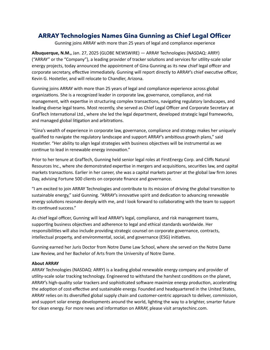 ARRAY Technologies Names Gina Gunning as Chief Legal Officer Gunning joins ARRAY with more than 25 years of legal and compliance experience Albuquerque, N.M., Jan. 27, 2025 (GLOBE NEWSWIRE) — ARRAY Technologies (NASDAQ: ARRY) (“ARRAY” or the “Company”), a leading provider of tracker solutions and services for utility-scale solar energy projects, today announced the appointment of Gina Gunning as its new chief legal officer and corporate secretary, effective immediately. Gunning will report directly to ARRAY’s chief executive officer, Kevin G. Hostetler, and will relocate to Chandler, Arizona. Gunning joins ARRAY with more than 25 years of legal and compliance experience across global organizations. She is a recognized leader in corporate law, governance, compliance, and risk management, with expertise in structuring complex transactions, navigating regulatory landscapes, and leading diverse legal teams. Most recently, she served as Chief Legal Officer and Corporate Secretary at GrafTech International Ltd., where she led the legal department, developed strategic legal frameworks, and managed global litigation and arbitrations. “Gina’s wealth of experience in corporate law, governance, compliance and strategy makes her uniquely qualified to navigate the regulatory landscape and support ARRAY’s ambitious growth plans,” said Hostetler. “Her ability to align legal strategies with business objectives will be instrumental as we continue to lead in renewable energy innovation.” Prior to her tenure at GrafTech, Gunning held senior legal roles at FirstEnergy Corp. and Cliffs Natural Resources Inc., where she demonstrated expertise in mergers and acquisitions, securities law, and capital markets transactions. Earlier in her career, she was a capital markets partner at the global law firm Jones Day, advising Fortune 500 clients on corporate finance and governance. “I am excited to join ARRAY Technologies and contribute to its mission of driving the global transition to sustainable energy,” said Gunning. “ARRAY’s innovative spirit and dedication to advancing renewable energy solutions resonate deeply with me, and I look forward to collaborating with the team to support its continued success.” As chief legal officer, Gunning will lead ARRAY’s legal, compliance, and risk management teams, supporting business objectives and adherence to legal and ethical standards worldwide. Her responsibilities will also include providing strategic counsel on corporate governance, contracts, intellectual property, and environmental, social, and governance (ESG) initiatives. Gunning earned her Juris Doctor from Notre Dame Law School, where she served on the Notre Dame Law Review, and her Bachelor of Arts from the University of Notre Dame. About ARRAY ARRAY Technologies (NASDAQ: ARRY) is a leading global renewable energy company and provider of utility-scale solar tracking technology. Engineered to withstand the harshest conditions on the planet, ARRAY’s high-quality solar trackers and sophisticated software maximize energy production, accelerating the adoption of cost-effective and sustainable energy. Founded and headquartered in the United States, ARRAY relies on its diversified global supply chain and customer-centric approach to deliver, commission, and support solar energy developments around the world, lighting the way to a brighter, smarter future for clean energy. For more news and information on ARRAY, please visit arraytechinc.com.