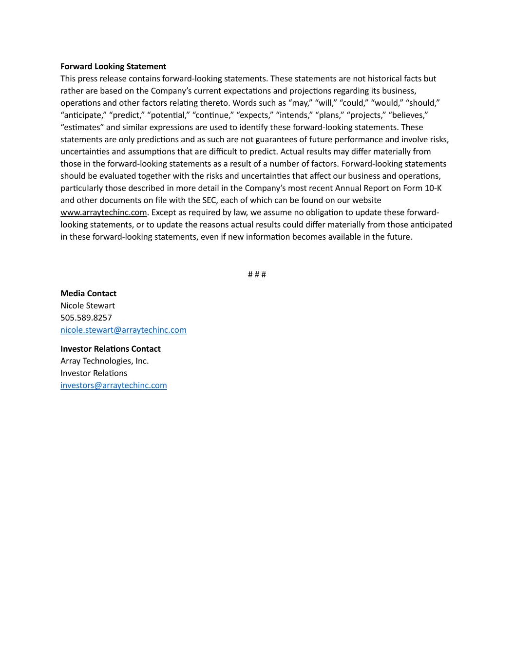 Forward Looking Statement This press release contains forward-looking statements. These statements are not historical facts but rather are based on the Company’s current expectations and projections regarding its business, operations and other factors relating thereto. Words such as “may,” “will,” “could,” “would,” “should,” “anticipate,” “predict,” “potential,” “continue,” “expects,” “intends,” “plans,” “projects,” “believes,” “estimates” and similar expressions are used to identify these forward-looking statements. These statements are only predictions and as such are not guarantees of future performance and involve risks, uncertainties and assumptions that are difficult to predict. Actual results may differ materially from those in the forward-looking statements as a result of a number of factors. Forward-looking statements should be evaluated together with the risks and uncertainties that affect our business and operations, particularly those described in more detail in the Company’s most recent Annual Report on Form 10-K and other documents on file with the SEC, each of which can be found on our website www.arraytechinc.com. Except as required by law, we assume no obligation to update these forward- looking statements, or to update the reasons actual results could differ materially from those anticipated in these forward-looking statements, even if new information becomes available in the future. # # # Media Contact Nicole Stewart 505.589.8257 nicole.stewart@arraytechinc.com Investor Relations Contact Array Technologies, Inc. Investor Relations investors@arraytechinc.com