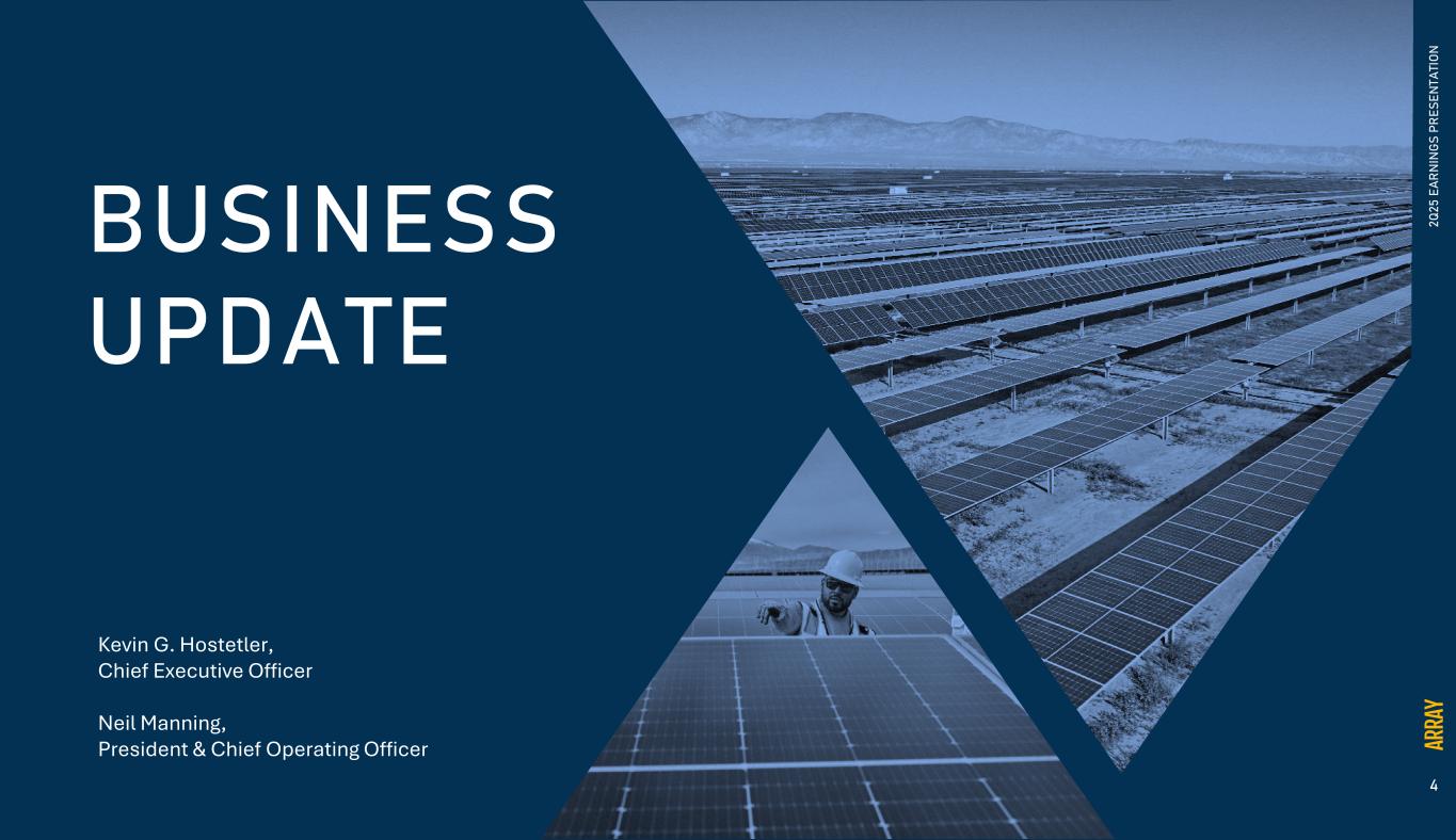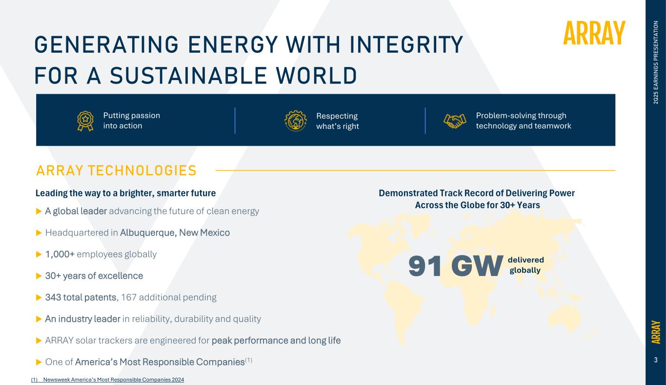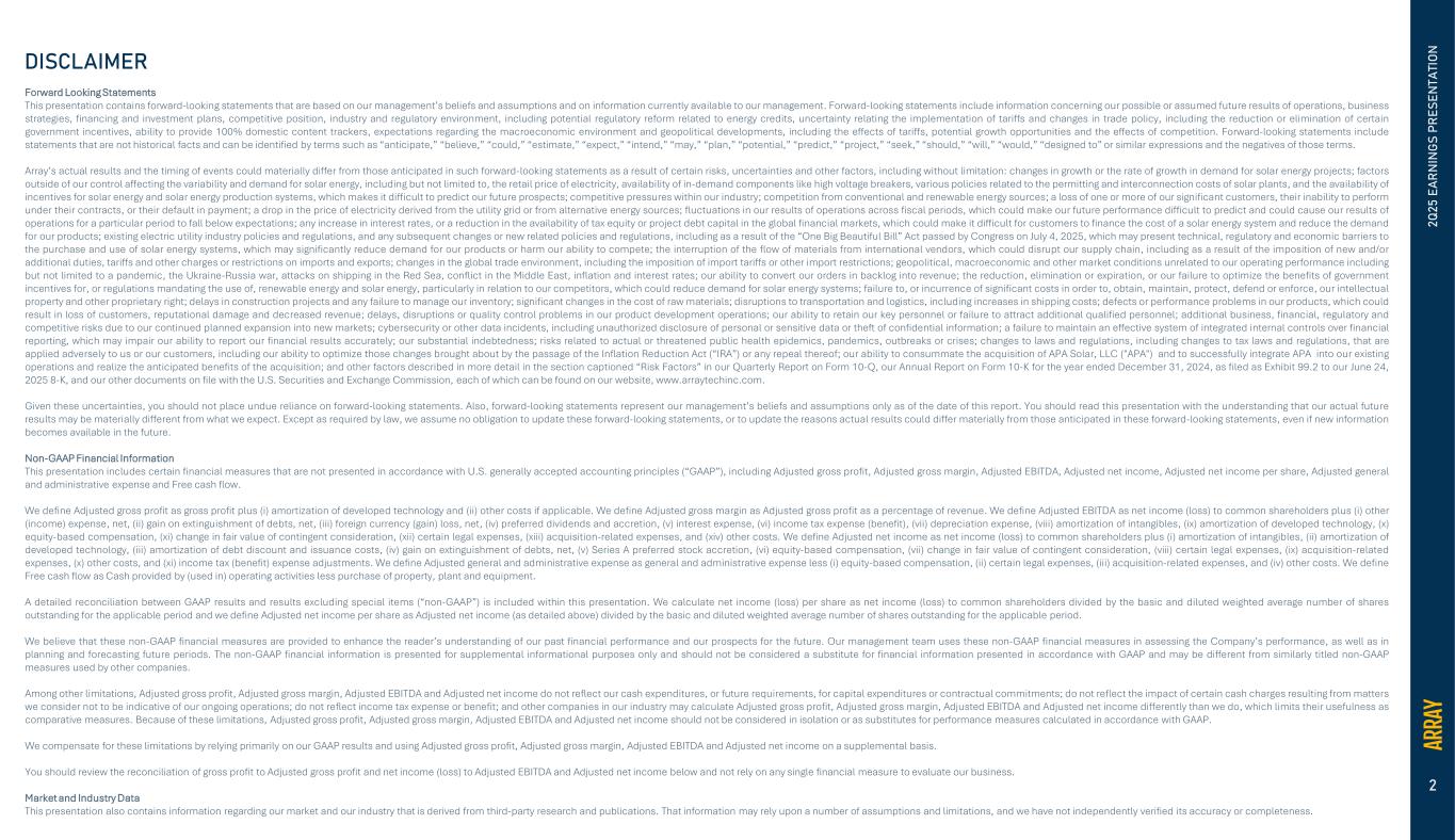 2 DISCLAIMER Forward Looking Statements This presentation contains forward-looking statements that are based on our management’s beliefs and assumptions and on information currently available to our management. Forward-looking statements include information concerning our possible or assumed future results of operations, business strategies, financing and investment plans, competitive position, industry and regulatory environment, including potential regulatory reform related to energy credits, uncertainty relating the implementation of tariffs and changes in trade policy, including the reduction or elimination of certain government incentives, ability to provide 100% domestic content trackers, expectations regarding the macroeconomic environment and geopolitical developments, including the effects of tariffs, potential growth opportunities and the effects of competition. Forward-looking statements include statements that are not historical facts and can be identified by terms such as “anticipate,” “believe,” “could,” “estimate,” “expect,” “intend,” “may,” “plan,” “potential,” “predict,” “project,” “seek,” “should,” “will,” “would,” “designed to” or similar expressions and the negatives of those terms. Array’s actual results and the timing of events could materially differ from those anticipated in such forward-looking statements as a result of certain risks, uncertainties and other factors, including without limitation: changes in growth or the rate of growth in demand for solar energy projects; factors outside of our control affecting the variability and demand for solar energy, including but not limited to, the retail price of electricity, availability of in-demand components like high voltage breakers, various policies related to the permitting and interconnection costs of solar plants, and the availability of incentives for solar energy and solar energy production systems, which makes it difficult to predict our future prospects; competitive pressures within our industry; competition from conventional and renewable energy sources; a loss of one or more of our significant customers, their inability to perform under their contracts, or their default in payment; a drop in the price of electricity derived from the utility grid or from alternative energy sources; fluctuations in our results of operations across fiscal periods, which could make our future performance difficult to predict and could cause our results of operations for a particular period to fall below expectations; any increase in interest rates, or a reduction in the availability of tax equity or project debt capital in the global financial markets, which could make it difficult for customers to finance the cost of a solar energy system and reduce the demand for our products; existing electric utility industry policies and regulations, and any subsequent changes or new related policies and regulations, including as a result of the “One Big Beautiful Bill” Act passed by Congress on July 4, 2025, which may present technical, regulatory and economic barriers to the purchase and use of solar energy systems, which may significantly reduce demand for our products or harm our ability to compete; the interruption of the flow of materials from international vendors, which could disrupt our supply chain, including as a result of the imposition of new and/or additional duties, tariffs and other charges or restrictions on imports and exports; changes in the global trade environment, including the imposition of import tariffs or other import restrictions; geopolitical, macroeconomic and other market conditions unrelated to our operating performance including but not limited to a pandemic, the Ukraine-Russia war, attacks on shipping in the Red Sea, conflict in the Middle East, inflation and interest rates; our ability to convert our orders in backlog into revenue; the reduction, elimination or expiration, or our failure to optimize the benefits of government incentives for, or regulations mandating the use of, renewable energy and solar energy, particularly in relation to our competitors, which could reduce demand for solar energy systems; failure to, or incurrence of significant costs in order to, obtain, maintain, protect, defend or enforce, our intellectual property and other proprietary right; delays in construction projects and any failure to manage our inventory; significant changes in the cost of raw materials; disruptions to transportation and logistics, including increases in shipping costs; defects or performance problems in our products, which could result in loss of customers, reputational damage and decreased revenue; delays, disruptions or quality control problems in our product development operations; our ability to retain our key personnel or failure to attract additional qualified personnel; additional business, financial, regulatory and competitive risks due to our continued planned expansion into new markets; cybersecurity or other data incidents, including unauthorized disclosure of personal or sensitive data or theft of confidential information; a failure to maintain an effective system of integrated internal controls over financial reporting, which may impair our ability to report our financial results accurately; our substantial indebtedness; risks related to actual or threatened public health epidemics, pandemics, outbreaks or crises; changes to laws and regulations, including changes to tax laws and regulations, that are applied adversely to us or our customers, including our ability to optimize those changes brought about by the passage of the Inflation Reduction Act (“IRA”) or any repeal thereof; our ability to consummate the acquisition of APA Solar, LLC ("APA") and to successfully integrate APA into our existing operations and realize the anticipated benefits of the acquisition; and other factors described in more detail in the secti