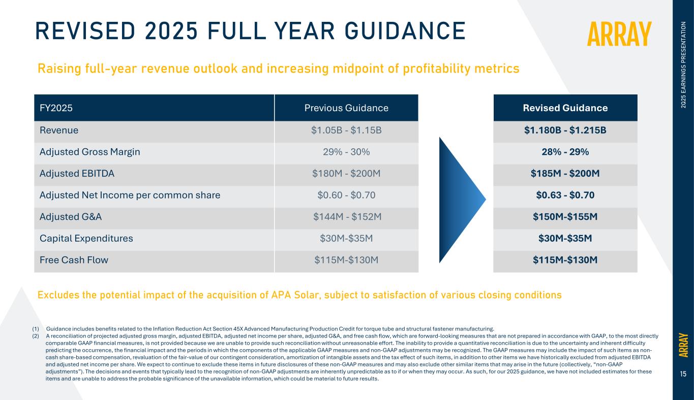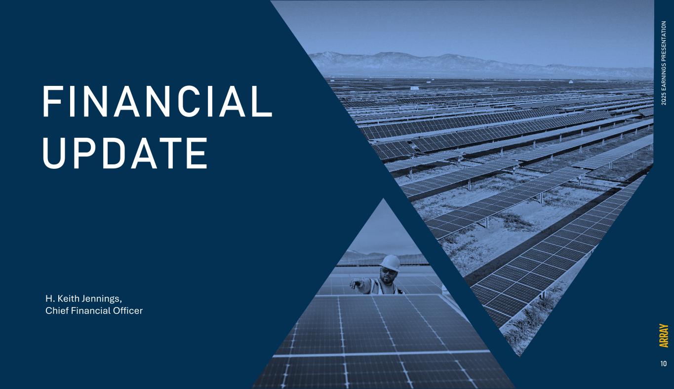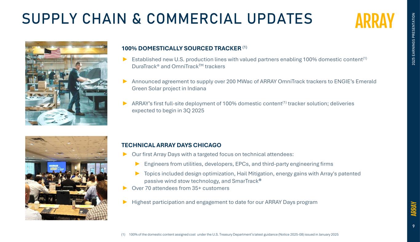 2 DISCLAIMER Forward Looking Statements This presentation contains forward-looking statements that are based on our management’s beliefs and assumptions and on information currently available to our management. Forward-looking statements include information concerning our possible or assumed future results of operations, business strategies, financing and investment plans, competitive position, industry and regulatory environment, including potential regulatory reform related to energy credits, uncertainty relating the implementation of tariffs and changes in trade policy, including the reduction or elimination of certain government incentives, ability to provide 100% domestic content trackers, expectations regarding the macroeconomic environment and geopolitical developments, including the effects of tariffs, potential growth opportunities and the effects of competition. Forward-looking statements include statements that are not historical facts and can be identified by terms such as “anticipate,” “believe,” “could,” “estimate,” “expect,” “intend,” “may,” “plan,” “potential,” “predict,” “project,” “seek,” “should,” “will,” “would,” “designed to” or similar expressions and the negatives of those terms. Array’s actual results and the timing of events could materially differ from those anticipated in such forward-looking statements as a result of certain risks, uncertainties and other factors, including without limitation: changes in growth or the rate of growth in demand for solar energy projects; factors outside of our control affecting the variability and demand for solar energy, including but not limited to, the retail price of electricity, availability of in-demand components like high voltage breakers, various policies related to the permitting and interconnection costs of solar plants, and the availability of incentives for solar energy and solar energy production systems, which makes it difficult to predict our future prospects; competitive pressures within our industry; competition from conventional and renewable energy sources; a loss of one or more of our significant customers, their inability to perform under their contracts, or their default in payment; a drop in the price of electricity derived from the utility grid or from alternative energy sources; fluctuations in our results of operations across fiscal periods, which could make our future performance difficult to predict and could cause our results of operations for a particular period to fall below expectations; any increase in interest rates, or a reduction in the availability of tax equity or project debt capital in the global financial markets, which could make it difficult for customers to finance the cost of a solar energy system and reduce the demand for our products; existing electric utility industry policies and regulations, and any subsequent changes or new related policies and regulations, including as a result of the “One Big Beautiful Bill” Act passed by Congress on July 4, 2025, which may present technical, regulatory and economic barriers to the purchase and use of solar energy systems, which may significantly reduce demand for our products or harm our ability to compete; the interruption of the flow of materials from international vendors, which could disrupt our supply chain, including as a result of the imposition of new and/or additional duties, tariffs and other charges or restrictions on imports and exports; changes in the global trade environment, including the imposition of import tariffs or other import restrictions; geopolitical, macroeconomic and other market conditions unrelated to our operating performance including but not limited to a pandemic, the Ukraine-Russia war, attacks on shipping in the Red Sea, conflict in the Middle East, inflation and interest rates; our ability to convert our orders in backlog into revenue; the reduction, elimination or expiration, or our failure to optimize the benefits of government incentives for, or regulations mandating the use of, renewable energy and solar energy, particularly in relation to our competitors, which could reduce demand for solar energy systems; failure to, or incurrence of significant costs in order to, obtain, maintain, protect, defend or enforce, our intellectual property and other proprietary right; delays in construction projects and any failure to manage our inventory; significant changes in the cost of raw materials; disruptions to transportation and logistics, including increases in shipping costs; defects or performance problems in our products, which could result in loss of customers, reputational damage and decreased revenue; delays, disruptions or quality control problems in our product development operations; our ability to retain our key personnel or failure to attract additional qualified personnel; additional business, financial, regulatory and competitive risks due to our continued planned expansion into new markets; cybersecurity or other data incidents, including unauthorized disclosure of personal or sensitive data or theft of confidential information; a failure to maintain an effective system of integrated internal controls over financial reporting, which may impair our ability to report our financial results accurately; our substantial indebtedness; risks related to actual or threatened public health epidemics, pandemics, outbreaks or crises; changes to laws and regulations, including changes to tax laws and regulations, that are applied adversely to us or our customers, including our ability to optimize those changes brought about by the passage of the Inflation Reduction Act (“IRA”) or any repeal thereof; our ability to consummate the acquisition of APA Solar, LLC ("APA") and to successfully integrate APA into our existing operations and realize the anticipated benefits of the acquisition; and other factors described in more detail in the secti