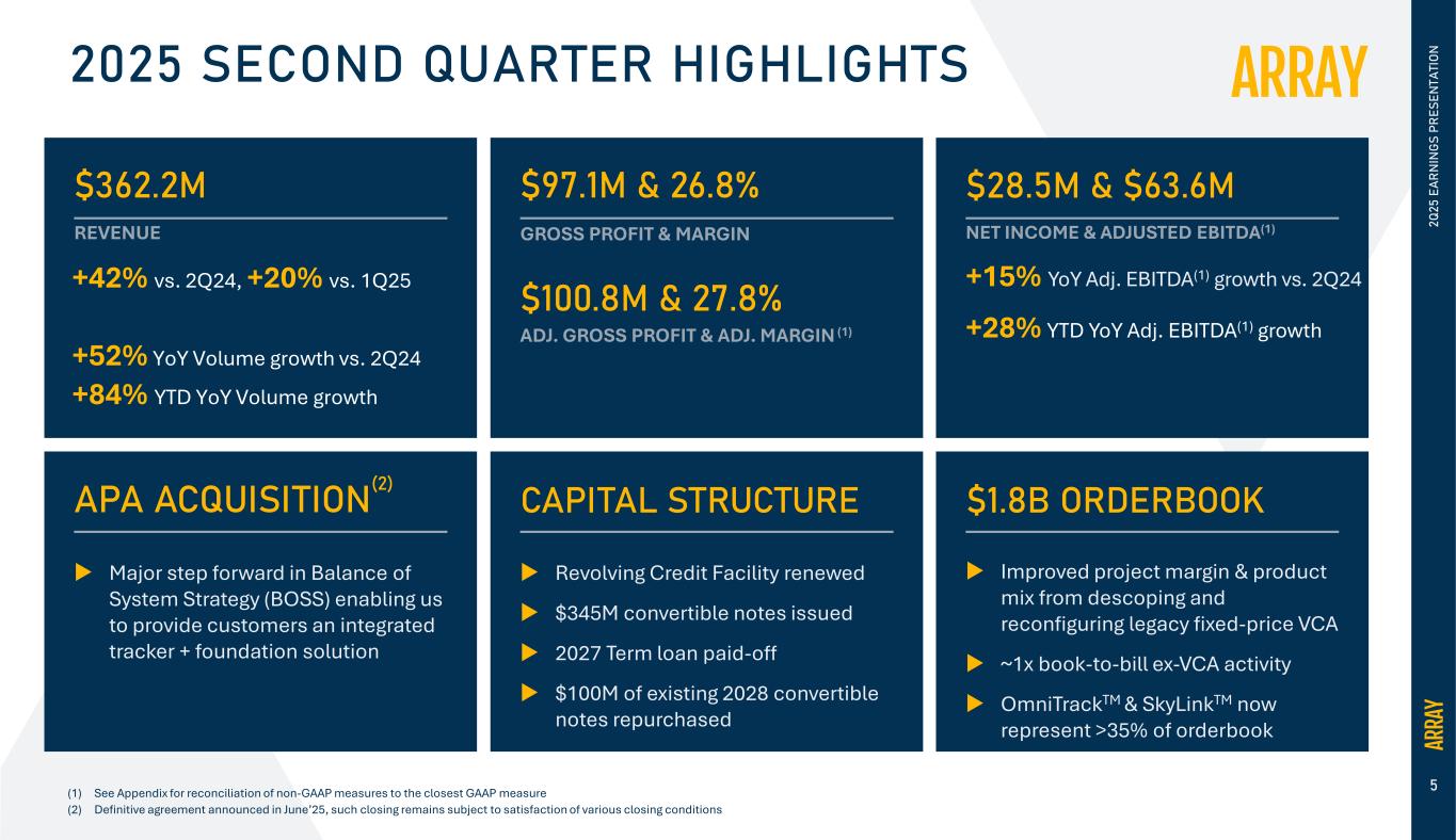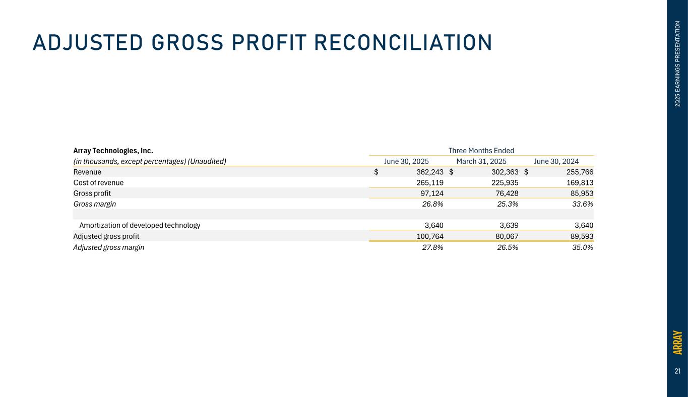 24 ADJUSTED NET INCOME RECONCILIATION Array Technologies, Inc. Three Months Ended (in thousands, except per share amounts) (Unaudited) June 30, 2025 March 31, 2025 June 30, 2024 Net Income $ 43,262 $ 16,746 $ 25,698 Preferred dividends and accretion 14,788 14,443 13,749 Net income to common shareholders $ 28,474 $ 2,303 $ 11,949 Amortization of intangibles 5,078 4,889 8,141 Amortization of developed technology 3,640 3,639 3,640 Amortization of debt discount and issuance costs 2,064 1,394 1,549 Gain on extinguishment of debts, net (14,207) - - Series A Preferred Stock accretion 7,393 7,241 6,805 Equity based compensation 3,898 2,798 808 Change in fair value of contingent consideration 150 (150) 503 Certain legal expenses (a) 149 1,083 1,533 Acquisition-related expenses(b) 3,087 - - Income tax expense of adjustments (c) (975) (3,474) (4,285) Adjusted net income $ 38,751 $ 19,723 $ 30,643 Income per common share Basic $ 0.19 $ 0.02 $ 0.08 Diluted $ 0.19 $ 0.02 $ 0.08 Weighted average number of common shares outstanding Basic 152,584 152,076 151,797 Diluted 153,068 152,783 152,207 Adjusted net income per common share Basic $ 0.25 $ 0.13 $ 0.20 Diluted $ 0.25 $ 0.13 $ 0.20 Weighted average number of common shares outstanding Basic 152,584 152,076 151,797 Diluted 153,068 152,783 152,207 (a)Represents certain legal fees and other related costs associated with (i) actions filed against the company and certain officers and directors alleging violations of the Securities Act of 1933 and the Securities Exchange Act of 1934, which litigation was dismissed with prejudice by the Court on May 19, 2023 and subsequently appealed. The appeal has been fully briefed, argued, and the Company is awaiting a decision, and (ii) legal and success fees related to a regional tax dispute for a period prior to the acquisition of STI, and (iii) other litigation and legal matters. We consider these costs not representative of legal costs that we will incur from time to time in the ordinary course of our business. (b) For the three months ended June 30, 2025, Acquisition-related expeneses. (c)Represents the estimated tax impact of all Adjusted Net Income add-backs, excluding those which represent permanent differences between book versus tax. 2Q 25 E AR N IN GS P RE SE N TA TI ON