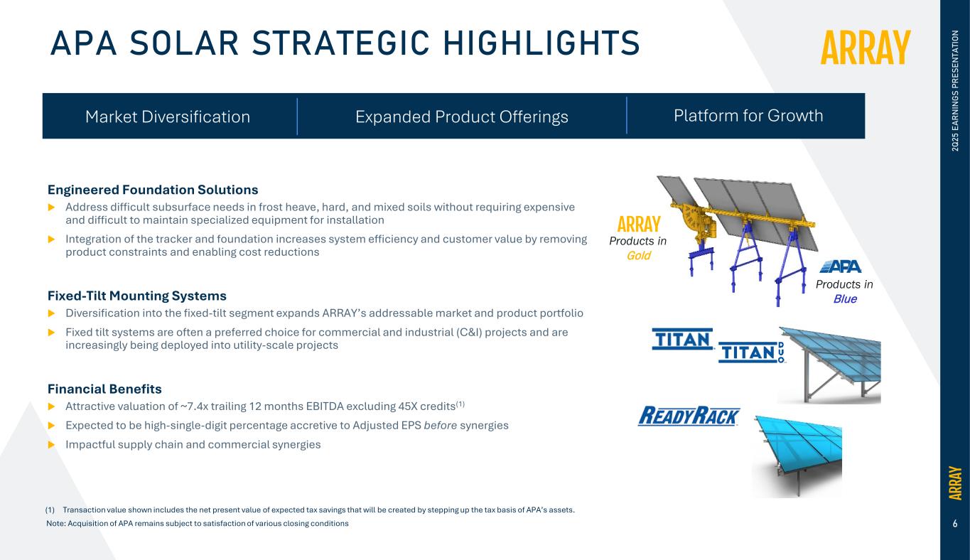 5 REVENUE �362.2M GROSS PROFIT & MARGIN  Improved project margin & product mix from descoping and reconfiguring legacy fixed-price VCA  ~1x book-to-bill ex-VCA activity  OmniTrackTM & SkyLinkTM now represent >35% of orderbook �1.8B ORDERBOOK  Revolving Credit Facility renewed  $345M convertible notes issued  2027 Term loan paid-off  $100M of existing 2028 convertible notes repurchased CAPITAL STRUCTURE 2Q 25 E AR N IN GS P RE SE N TA TI ON2025 SECOND QUARTER HIGHLIGHTS �28.5M & �63.6M +15% YoY Adj. EBITDA(1) growth vs. 2Q24 +28% YTD YoY Adj. EBITDA(1) growth NET INCOME & ADJUSTED EBITDA(1) (1) See Appendix for reconciliation of non-GAAP measures to the closest GAAP measure (2) Definitive agreement announced in June’25, such closing remains subject to satisfaction of various closing conditions �97.1M & 26.8% ADJ. GROSS PROFIT & ADJ. MARGIN (1) �100.8M & 27.8%+42% vs. 2Q24, +20% vs. 1Q25 +52% YoY Volume growth vs. 2Q24 +84% YTD YoY Volume growth APA ACQUISITION(2)  Major step forward in Balance of System Strategy (BOSS) enabling us to provide customers an integrated tracker + foundation solution
