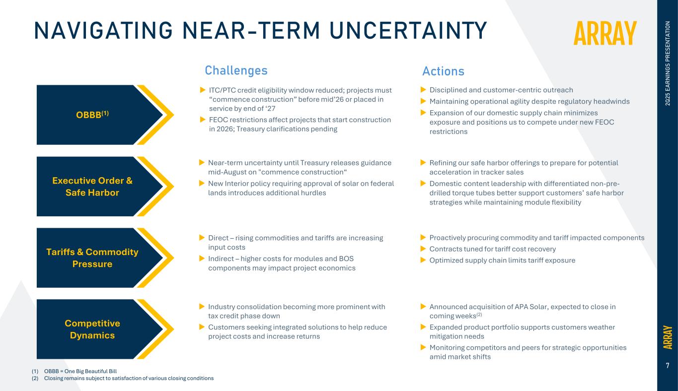 6 APA SOLAR STRATEGIC HIGHLIGHTS Market Diversification Expanded Product Offerings Engineered Foundation Solutions  Address difficult subsurface needs in frost heave, hard, and mixed soils without requiring expensive and difficult to maintain specialized equipment for installation  Integration of the tracker and foundation increases system efficiency and customer value by removing product constraints and enabling cost reductions Fixed-Tilt Mounting Systems  Diversification into the fixed-tilt segment expands ARRAY’s addressable market and product portfolio  Fixed tilt systems are often a preferred choice for commercial and industrial (C&I) projects and are increasingly being deployed into utility-scale projects Financial Benefits  Attractive valuation of ~7.4x trailing 12 months EBITDA excluding 45X credits(1)  Expected to be high-single-digit percentage accretive to Adjusted EPS before synergies  Impactful supply chain and commercial synergies Platform for Growth (1) Transaction value shown includes the net present value of expected tax savings that will be created by stepping up the tax basis of APA’s assets. Products in Gold Products in Blue 2Q 25 E AR N IN GS P RE SE N TA TI ON Note: Acquisition of APA remains subject to satisfaction of various closing conditions