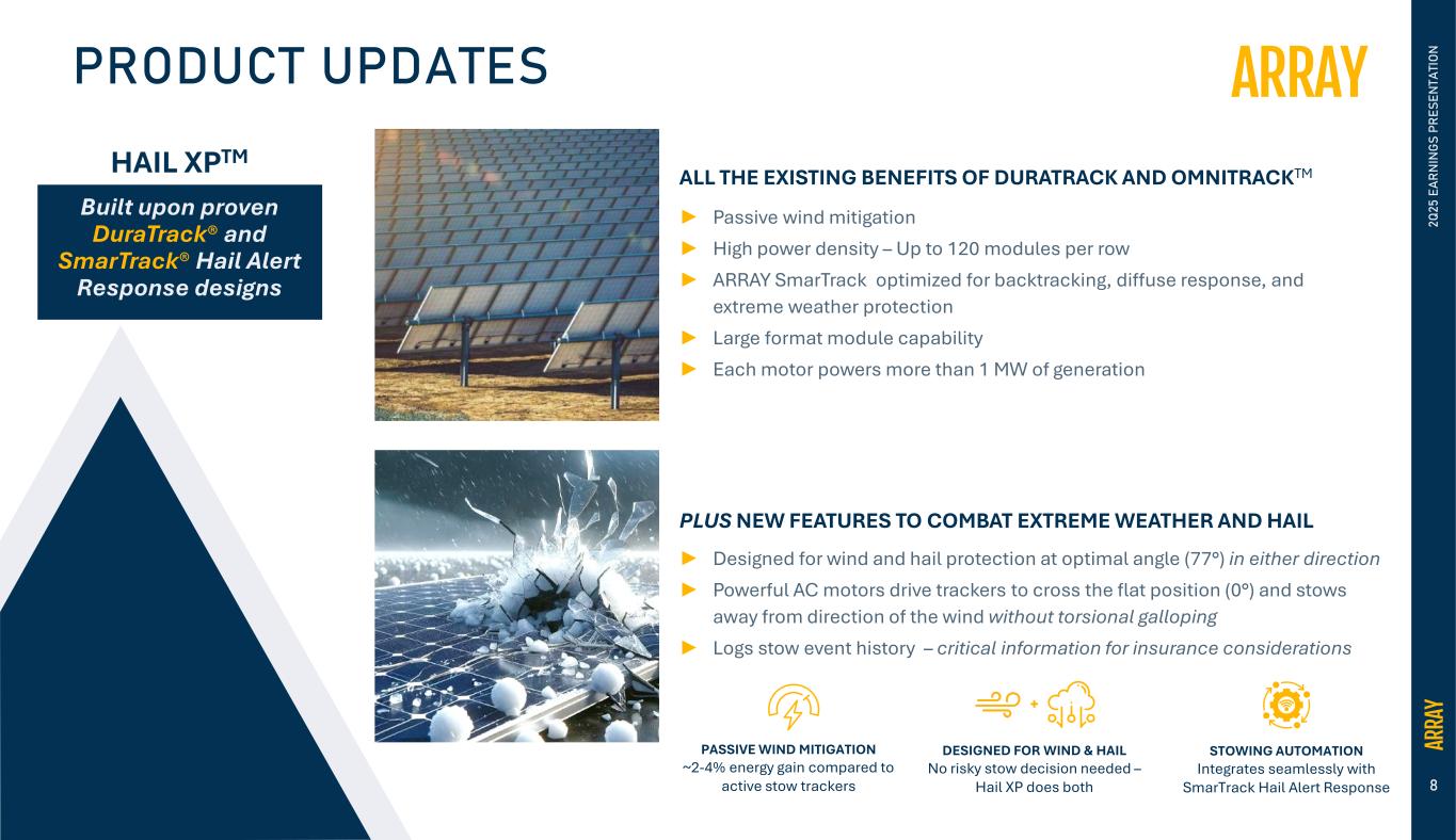 Highly confidential – Internal use only 8 ALL THE EXISTING BENEFITS OF DURATRACK AND OMNITRACKTM ► Passive wind mitigation ► High power density – Up to 120 modules per row ► ARRAY SmarTrack optimized for backtracking, diffuse response, and extreme weather protection ► Large format module capability ► Each motor powers more than 1 MW of generation PLUS NEW FEATURES TO COMBAT EXTREME WEATHER AND HAIL ► Designed for wind and hail protection at optimal angle (77°) in either direction ► Powerful AC motors drive trackers to cross the flat position (0°) and stows away from direction of the wind without torsional galloping ► Logs stow event history – critical information for insurance considerations 2Q 25 E AR N IN GS P RE SE N TA TI ONPRODUCT UPDATES HAIL XPTM PASSIVE WIND MITIGATION ~2-4% energy gain compared to active stow trackers DESIGNED FOR WIND & HAIL No risky stow decision needed – Hail XP does both + STOWING AUTOMATION Integrates seamlessly with SmarTrack Hail Alert Response Built upon proven DuraTrack® and SmarTrack® Hail Alert Response designs
