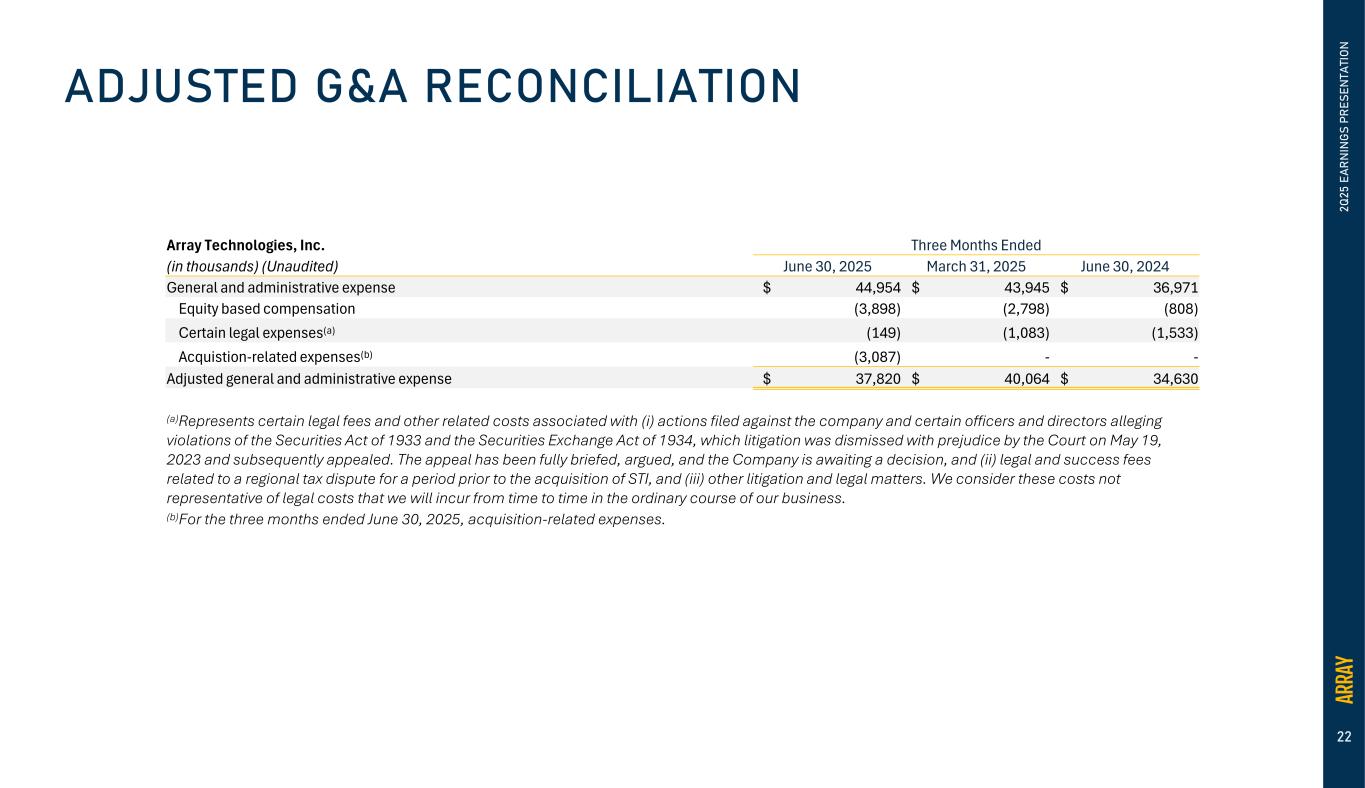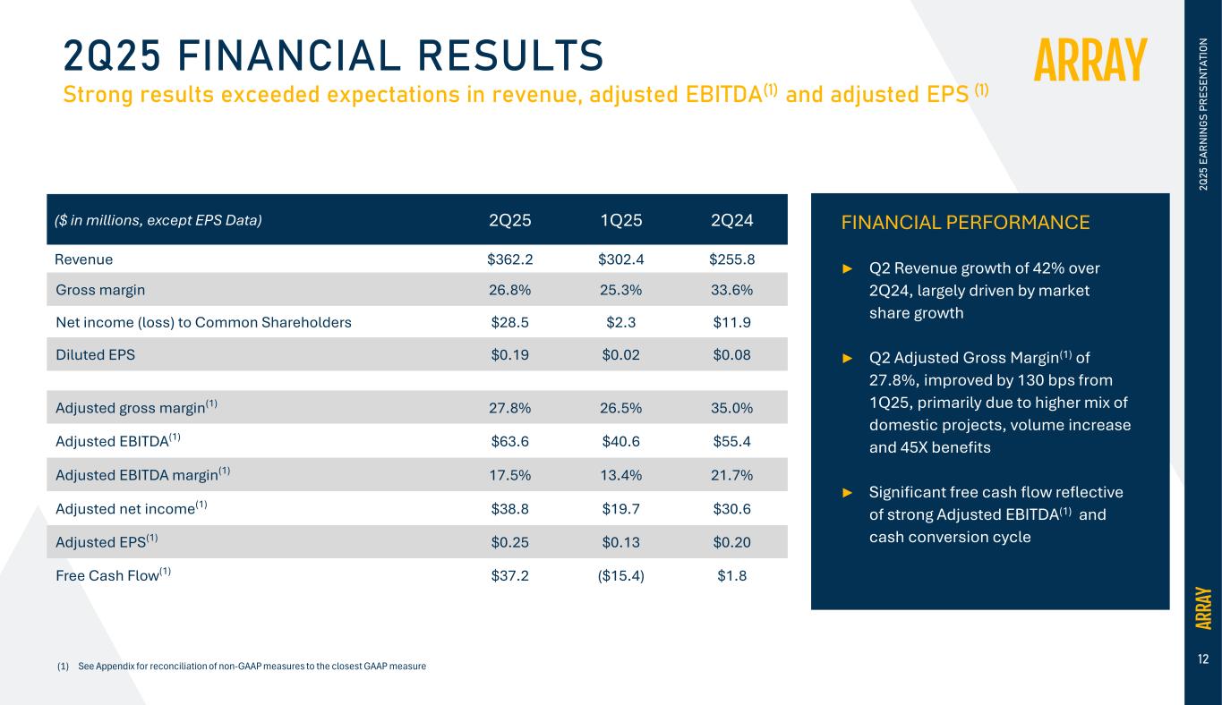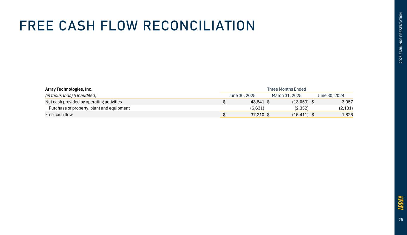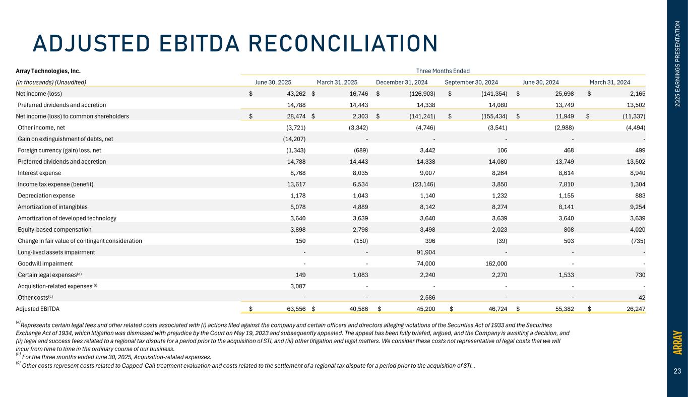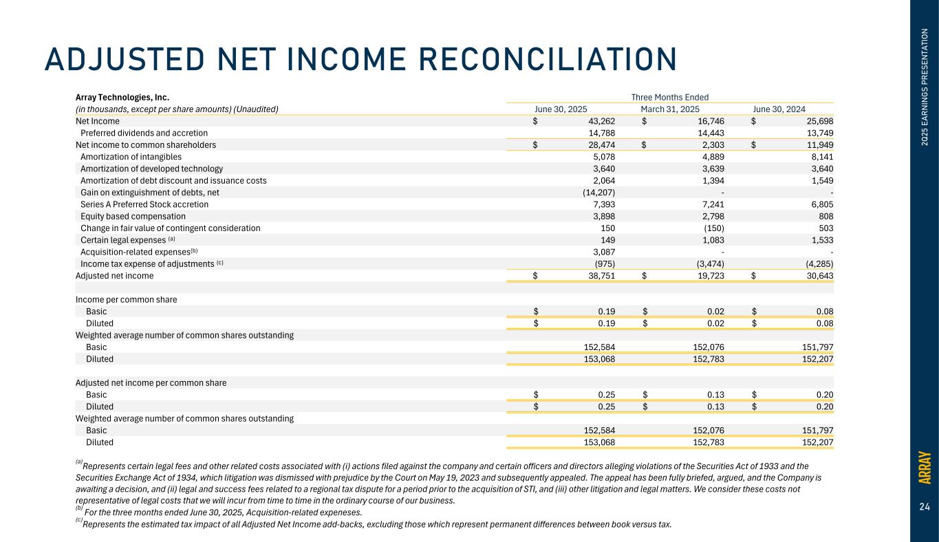 23 ADJUSTED EBITDA RECONCILIATION 2Q 25 E AR N IN GS P RE SE N TA TI ON Array Technologies, Inc. Three Months Ended (in thousands) (Unaudited) June 30, 2025 March 31, 2025 December 31, 2024 September 30, 2024 June 30, 2024 March 31, 2024 Net income (loss) $ 43,262 $ 16,746 $ (126,903) $ (141,354) $ 25,698 $ 2,165 Preferred dividends and accretion 14,788 14,443 14,338 14,080 13,749 13,502 Net income (loss) to common shareholders $ 28,474 $ 2,303 $ (141,241) $ (155,434) $ 11,949 $ (11,337) Other income, net (3,721) (3,342) (4,746) (3,541) (2,988) (4,494) Gain on extinguishment of debts, net (14,207) - - - - - Foreign currency (gain) loss, net (1,343) (689) 3,442 106 468 499 Preferred dividends and accretion 14,788 14,443 14,338 14,080 13,749 13,502 Interest expense 8,768 8,035 9,007 8,264 8,614 8,940 Income tax expense (benefit) 13,617 6,534 (23,146) 3,850 7,810 1,304 Depreciation expense 1,178 1,043 1,140 1,232 1,155 883 Amortization of intangibles 5,078 4,889 8,142 8,274 8,141 9,254 Amortization of developed technology 3,640 3,639 3,640 3,639 3,640 3,639 Equity-based compensation 3,898 2,798 3,498 2,023 808 4,020 Change in fair value of contingent consideration 150 (150) 396 (39) 503 (735) Long-lived assets impairment - - 91,904 - - - Goodwill impairment - - 74,000 162,000 - - Certain legal expenses(a) 149 1,083 2,240 2,270 1,533 730 Acquistion-related expenses(b) 3,087 - - - - - Other costs(c) - - 2,586 - - 42 Adjusted EBITDA $ 63,556 $ 40,586 $ 45,200 $ 46,724 $ 55,382 $ 26,247 (a)Represents certain legal fees and other related costs associated with (i) actions filed against the company and certain officers and directors alleging violations of the Securities Act of 1933 and the Securities Exchange Act of 1934, which litigation was dismissed with prejudice by the Court on May 19, 2023 and subsequently appealed. The appeal has been fully briefed, argued, and the Company is awaiting a decision, and (ii) legal and success fees related to a regional tax dispute for a period prior to the acquisition of STI, and (iii) other litigation and legal matters. We consider these costs not representative of legal costs that we will incur from time to time in the ordinary course of our business. (b) For the three months ended June 30, 2025, Acquisition-related expenses. (c) Other costs represent costs related to Capped-Call treatment evaluation and costs related to the settlement of a regional tax dispute for a period prior to the acquisition of STI. .
