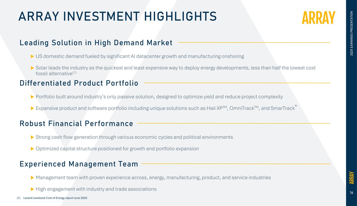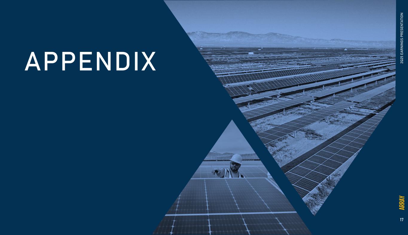 16 2Q 25 E AR N IN GS P RE SE N TA TI ONARRAY INVESTMENT HIGHLIGHTS Leading Solution in High Demand Market  US domestic demand fueled by significant AI datacenter growth and manufacturing onshoring  Solar leads the industry as the quickest and least expensive way to deploy energy developments, less than half the lowest cost fossil alternative(1) Differentiated Product Portfolio  Portfolio built around industry’s only passive solution, designed to optimize yield and reduce project complexity  Expansive product and software portfolio including unique solutions such as Hail XPTM, OmniTrackTM, and SmarTrack® Robust Financial Performance  Strong cash flow generation through various economic cycles and political environments  Optimized capital structure positioned for growth and portfolio expansion Experienced Management Team  Management team with proven experience across, energy, manufacturing, product, and service industries  High engagement with industry and trade associations (1) Lazard Levelized Cost of Energy report June 2025