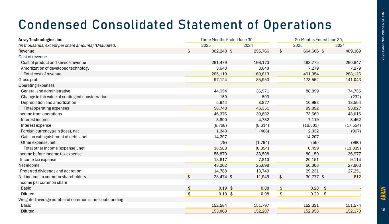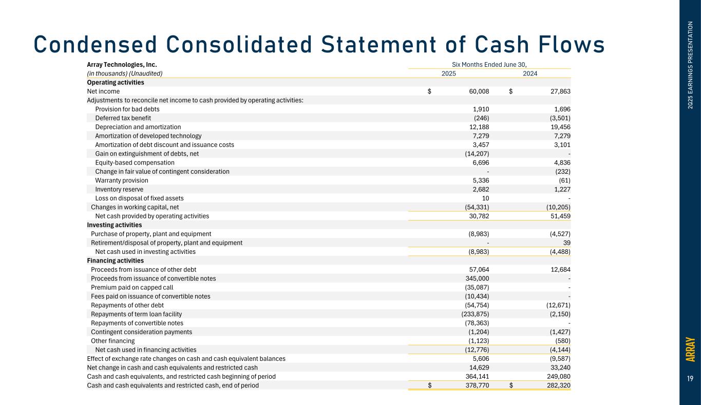 18 Condensed Consolidated Statement of Operations Array Technologies, Inc. Three Months Ended June 30, Six Months Ended June 30, (in thousands, except per share amounts) (Unaudited) 2025 2024 2025 2024 Revenue $ 362,243 $ 255,766 $ 664,606 $ 409,169 Cost of revenue Cost of product and service revenue 261,479 166,173 483,775 260,847 Amortization of developed technology 3,640 3,640 7,279 7,279 Total cost of revenue 265,119 169,813 491,054 268,126 Gross profit 97,124 85,953 173,552 141,043 Operating expenses General and administrative 44,954 36,971 88,899 74,755 Change in fair value of contingent consideration 150 503 - (232) Depreciation and amortization 5,644 8,877 10,993 18,504 Total operating expenses 50,748 46,351 99,892 93,027 Income from operations 46,376 39,602 73,660 48,016 Interest income 3,800 4,782 7,119 8,462 Interest expense (8,768) (8,614) (16,803) (17,554) Foreign currency gain (loss), net 1,343 (468) 2,032 (967) Gain on extinguishment of debts, net 14,207 - 14,207 - Other expense, net (79) (1,794) (56) (980) Total other income (expense), net 10,503 (6,094) 6,499 (11,039) Income before income tax expense 56,879 33,508 80,159 36,977 Income tax expense 13,617 7,810 20,151 9,114 Net income 43,262 25,698 60,008 27,863 Preferred dividends and accretion 14,788 13,749 29,231 27,251 Net income to common shareholders $ 28,474 $ 11,949 $ 30,777 $ 612 Income per common share Basic $ 0.19 $ 0.08 $ 0.20 $ - Diluted $ 0.19 $ 0.08 $ 0.20 $ - Weighted average number of common shares outstanding Basic 152,584 151,797 152,331 151,574 Diluted 153,068 152,207 152,958 152,170 2Q 25 E AR N IN GS P RE SE N TA TI ON