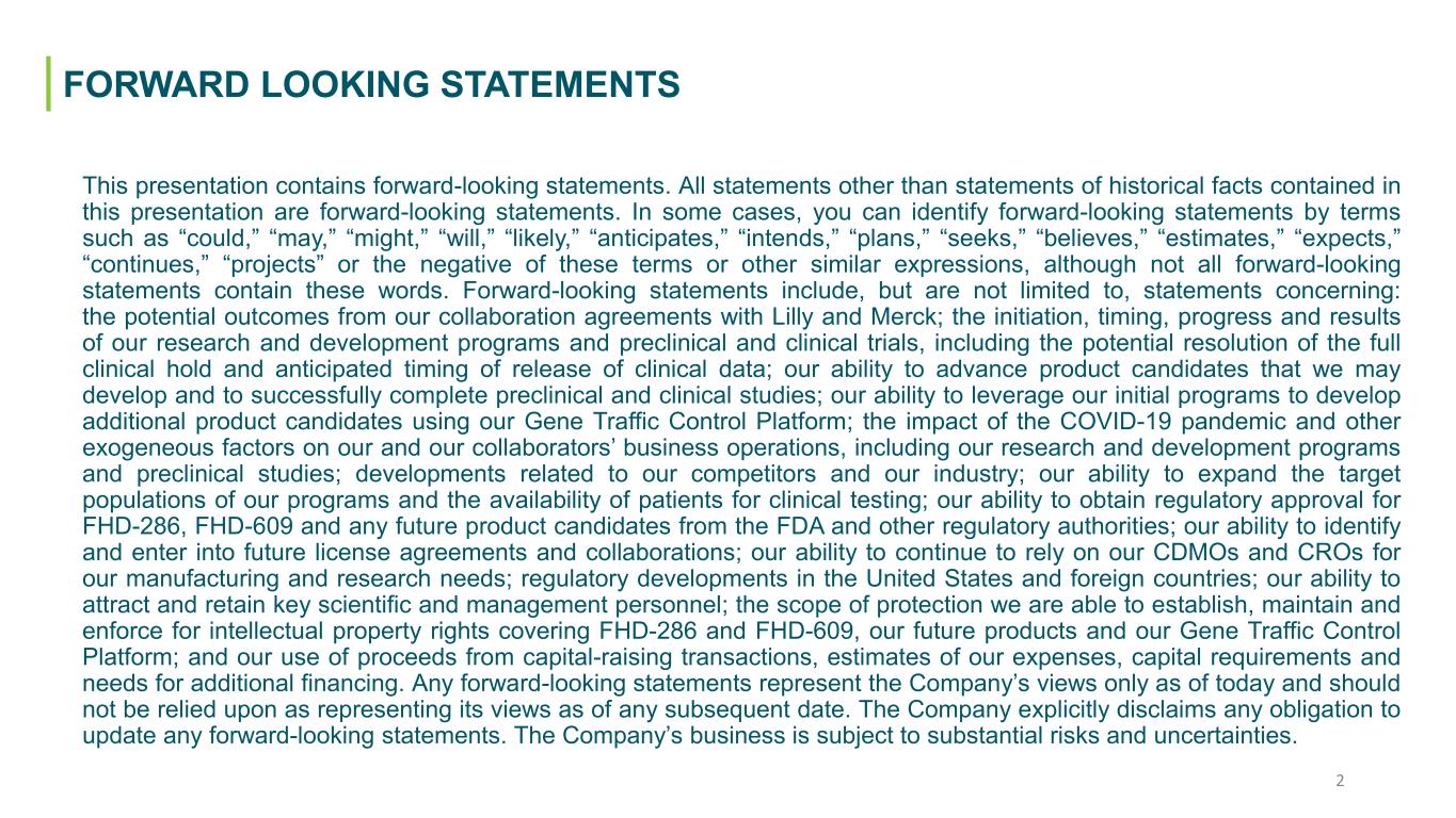 This presentation contains forward-looking statements. All statements other than statements of historical facts contained in this presentation are forward-looking statements. In some cases, you can identify forward-looking statements by terms such as “could,” “may,” “might,” “will,” “likely,” “anticipates,” “intends,” “plans,” “seeks,” “believes,” “estimates,” “expects,” “continues,” “projects” or the negative of these terms or other similar expressions, although not all forward-looking statements contain these words. Forward-looking statements include, but are not limited to, statements concerning: the potential outcomes from our collaboration agreements with Lilly and Merck; the initiation, timing, progress and results of our research and development programs and preclinical and clinical trials, including the potential resolution of the full clinical hold and anticipated timing of release of clinical data; our ability to advance product candidates that we may develop and to successfully complete preclinical and clinical studies; our ability to leverage our initial programs to develop additional product candidates using our Gene Traffic Control Platform; the impact of the COVID-19 pandemic and other exogeneous factors on our and our collaborators’ business operations, including our research and development programs and preclinical studies; developments related to our competitors and our industry; our ability to expand the target populations of our programs and the availability of patients for clinical testing; our ability to obtain regulatory approval for FHD-286, FHD-609 and any future product candidates from the FDA and other regulatory authorities; our ability to identify and enter into future license agreements and collaborations; our ability to continue to rely on our CDMOs and CROs for our manufacturing and research needs; regulatory developments in the United States and foreign countries; our ability to attract and retain key scientific and management personnel; the scope of protection we are able to establish, maintain and enforce for intellectual property rights covering FHD-286 and FHD-609, our future products and our Gene Traffic Control Platform; and our use of proceeds from capital-raising transactions, estimates of our expenses, capital requirements and needs for additional financing. Any forward-looking statements represent the Company’s views only as of today and should not be relied upon as representing its views as of any subsequent date. The Company explicitly disclaims any obligation to update any forward-looking statements. The Company’s business is subject to substantial risks and uncertainties. Forward-Looking StatementsFORWARD LOOKING STATEMENTS 2