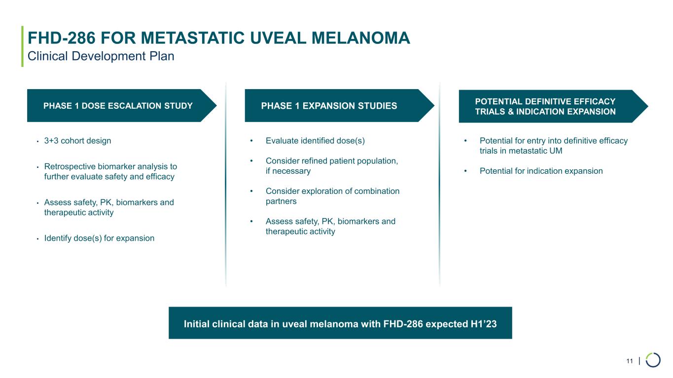 | POTENTIAL DEFINITIVE EFFICACY TRIALS & INDICATION EXPANSIONPHASE 1 DOSE ESCALATION STUDY PHASE 1 EXPANSION STUDIES 11 • Evaluate identified dose(s) • Consider refined patient population, if necessary • Consider exploration of combination partners • Assess safety, PK, biomarkers and therapeutic activity • Potential for entry into definitive efficacy trials in metastatic UM • Potential for indication expansion FHD-286 FOR METASTATIC UVEAL MELANOMA Clinical Development Plan Initial clinical data in uveal melanoma with FHD-286 expected H1’23 • 3+3 cohort design • Retrospective biomarker analysis to further evaluate safety and efficacy • Assess safety, PK, biomarkers and therapeutic activity • Identify dose(s) for expansion