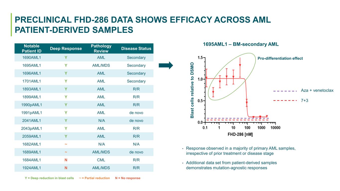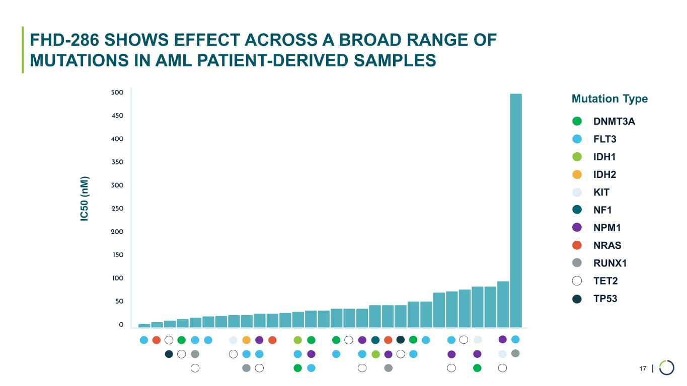 | FHD-286 SHOWS EFFECT ACROSS A BROAD RANGE OF MUTATIONS IN AML PATIENT-DERIVED SAMPLES DNMT3A FLT3 IDH1 IDH2 KIT NF1 NPM1 NRAS RUNX1 TET2 TP53 IC 50 (n M ) 17 Mutation Type