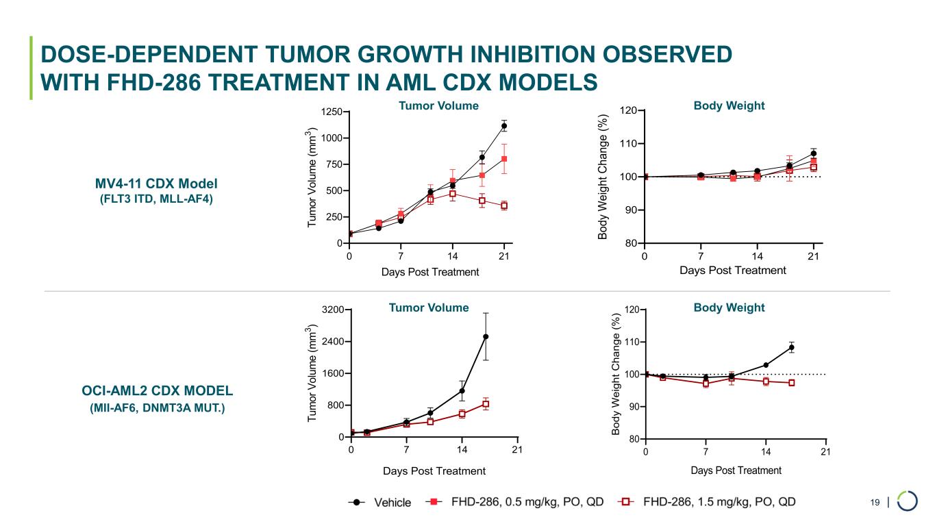 | DOSE-DEPENDENT TUMOR GROWTH INHIBITION OBSERVED WITH FHD-286 TREATMENT IN AML CDX MODELS MV4-11 CDX Model (FLT3 ITD, MLL-AF4) OCI-AML2 CDX MODEL (MII-AF6, DNMT3A MUT.) 0 7 14 21 0 250 500 750 1000 1250 Days Post Treatment Tu m or V ol um e (m m 3 ) 0 7 14 21 0 800 1600 2400 3200 Days Post Treatment Tu m or V ol um e (m m 3 ) 0 7 14 21 80 90 100 110 120 Days Post Treatment Bo dy W ei gh t C ha ng e (% ) 0 7 14 21 80 90 100 110 120 Days Post Treatment B od y W ei gh t C ha ng e (% ) 19 Tumor Volume Tumor Volume Body Weight Body Weight