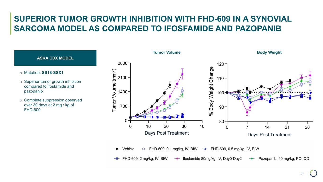 | SUPERIOR TUMOR GROWTH INHIBITION WITH FHD-609 IN A SYNOVIAL SARCOMA MODEL AS COMPARED TO IFOSFAMIDE AND PAZOPANIB o Mutation: SS18-SSX1 o Superior tumor growth inhibition compared to ifosfamide and pazopanib o Complete suppression observed over 30 days at 2 mg / kg of FHD-609 ASKA CDX MODEL Tumor Volume Body Weight 0 7 14 21 28 80 90 100 110 120 Days Post Treatment % Bo d y W ei gh t C ha ng e 0 10 20 30 40 0 700 1400 2100 2800 Days Post Treatment Tu m or Vo lu m e ( m m 3 ) 27