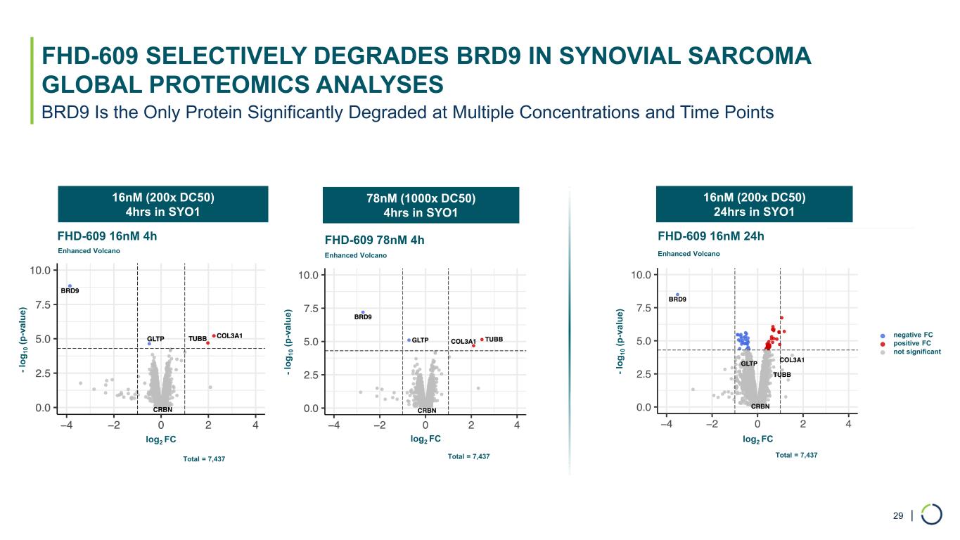 | FHD-609 SELECTIVELY DEGRADES BRD9 IN SYNOVIAL SARCOMA GLOBAL PROTEOMICS ANALYSES BRD9 Is the Only Protein Significantly Degraded at Multiple Concentrations and Time Points 29 16nM (200x DC50) 4hrs in SYO1 78nM (1000x DC50) 4hrs in SYO1 16nM (200x DC50) 24hrs in SYO1 FHD-609 16nM 4h FHD-609 78nM 4h FHD-609 16nM 24h Enhanced Volcano Enhanced Volcano Enhanced Volcano Total = 7,437 Total = 7,437 Total = 7,437 log2 FC log2 FC log2 FC -l og 10 (p -v al ue ) -l og 10 (p -v al ue ) -l og 10 (p -v al ue ) negative FC positive FC not significant