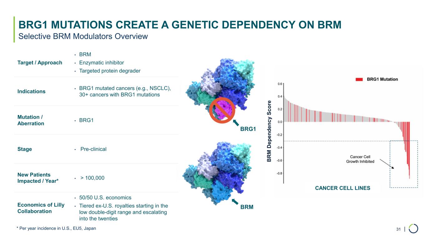 | BRG1 MUTATIONS CREATE A GENETIC DEPENDENCY ON BRM BRG1 B R M D ep en de nc y Sc or e CANCER CELL LINES Selective BRM Modulators Overview BRM Target / Approach • BRM • Enzymatic inhibitor • Targeted protein degrader Indications • BRG1 mutated cancers (e.g., NSCLC), 30+ cancers with BRG1 mutations Mutation / Aberration • BRG1 Stage • Pre-clinical New Patients Impacted / Year* • > 100,000 Economics of Lilly Collaboration • 50/50 U.S. economics • Tiered ex-U.S. royalties starting in the low double-digit range and escalating into the twenties * Per year incidence in U.S., EU5, Japan 31