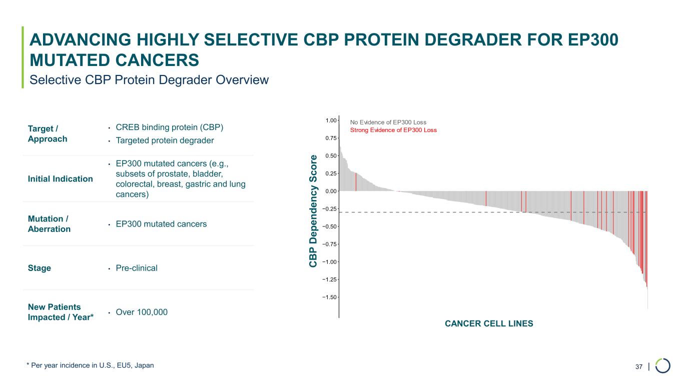 | ADVANCING HIGHLY SELECTIVE CBP PROTEIN DEGRADER FOR EP300 MUTATED CANCERS Selective CBP Protein Degrader Overview * Per year incidence in U.S., EU5, Japan Target / Approach • CREB binding protein (CBP) • Targeted protein degrader Initial Indication • EP300 mutated cancers (e.g., subsets of prostate, bladder, colorectal, breast, gastric and lung cancers) Mutation / Aberration • EP300 mutated cancers Stage • Pre-clinical New Patients Impacted / Year* • Over 100,000 37 C B P D ep en de nc y Sc or e CANCER CELL LINES