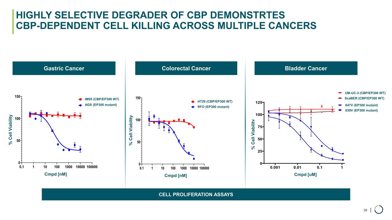 | HIGHLY SELECTIVE DEGRADER OF CBP DEMONSTRTES CBP-DEPENDENT CELL KILLING ACROSS MULTIPLE CANCERS 39 Colorectal CancerGastric Cancer 0.1 1 10 100 1000 10000 100000 0 50 100 150 Cmpd[nM] RKO (EP300 mutant) HT29 (CBP/EP300 Wt) % C el l V ia bi lit y Cmpd [nM] HT29 (CBP/EP300 WT) RFO (EP300 mutant) % C el l V ia bi lit y 0.1 1 10 100 1000 10000 100000 0 50 100 150 Cmpd[nM] AGS (EP300 mutant) IM95 (CBP/EP300 Wt) Cmpd [nM] IM95 (CBP/EP3 0 WT) AGS (EP300 mutant) 0.001 0.01 0.1 1 0 25 50 75 100 125 Cmpd [uM] % C el l V ia bi lit y 647V (CBP dependent) 639V (CBP dependent) UM-UC-3 (Dual dependent) ScaBER (Dual dependent) % C el l V ia bi lit y Cmpd [u ] UM-UC-3 (CBP/EP300 WT) ScaBER (CBP/EP300 WT) 647V (EP300 mutant) 639V (EP300 mutant) Bladder Cancer CELL PROLIFERATION ASSAYS