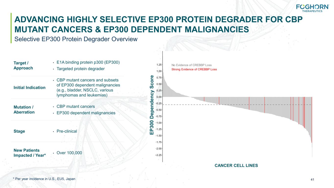 ADVANCING HIGHLY SELECTIVE EP300 PROTEIN DEGRADER FOR CBP MUTANT CANCERS & EP300 DEPENDENT MALIGNANCIES Selective EP300 Protein Degrader Overview * Per year incidence in U.S., EU5, Japan Target / Approach • E1A binding protein p300 (EP300) • Targeted protein degrader Initial Indication • CBP mutant cancers and subsets of EP300 dependent malignancies (e.g., bladder, NSCLC, various lymphomas and leukemias) Mutation / Aberration • CBP mutant cancers • EP300 dependent malignancies Stage • Pre-clinical New Patients Impacted / Year* • Over 100,000 41 EP 30 0 D ep en de nc y Sc or e CANCER CELL LINES