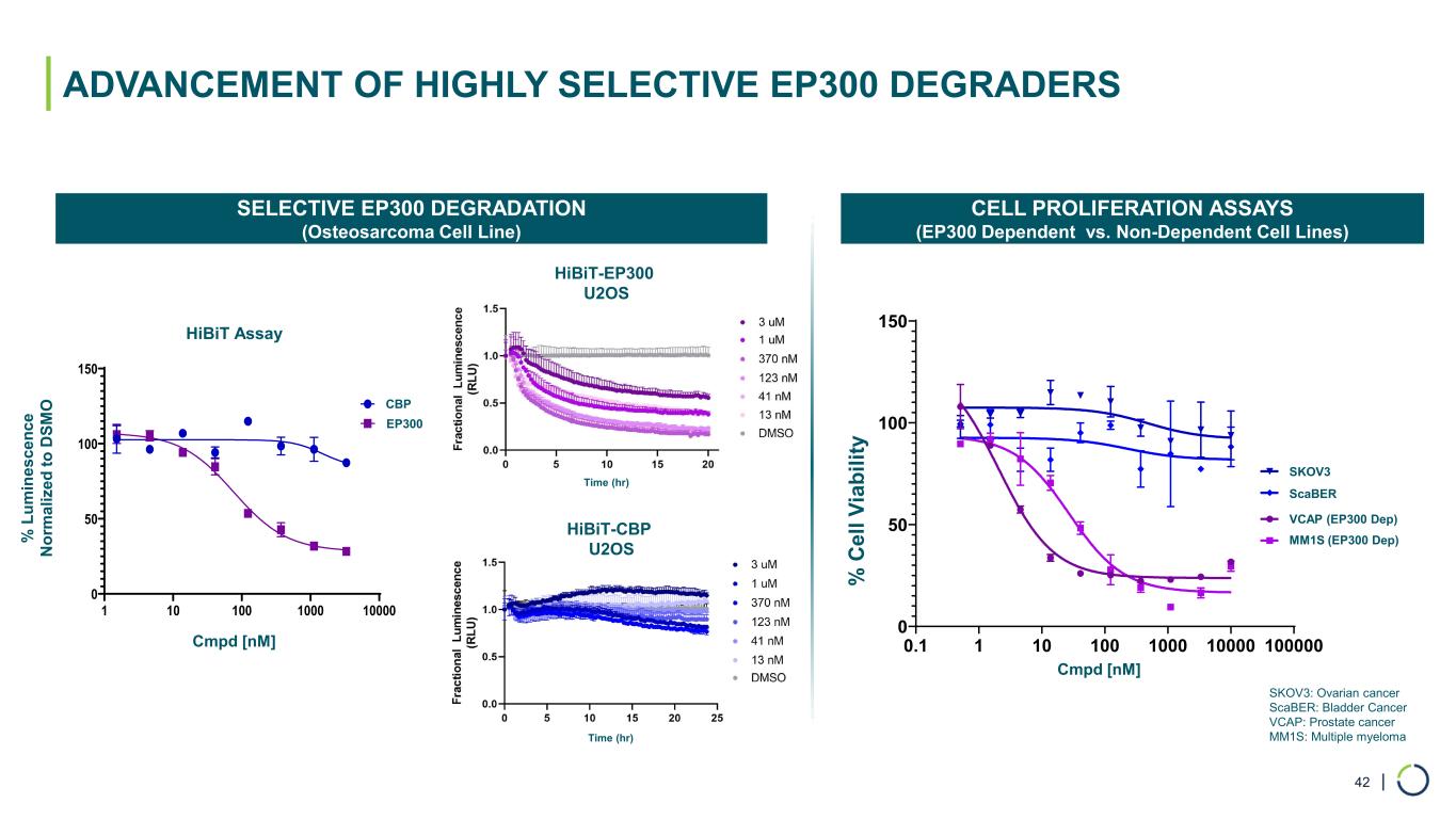 | ADVANCEMENT OF HIGHLY SELECTIVE EP300 DEGRADERS 42 SELECTIVE EP300 DEGRADATION (Osteosarcoma Cell Line) CELL PROLIFERATION ASSAYS (EP300 Dependent vs. Non-Dependent Cell Lines) HiBiT-CBP U2OS HiBiT-EP300 U2OS Time (hr) Time (hr) HiBiT Assay 1 10 100 1000 10000 0 50 100 150 Cmpd [nM] % L um in es ce nc e no rm al iz ed to D M S O CBP EP300 % L um in es ce nc e N or m al iz ed to D SM O Cmpd [nM] C EP3 % C el l V ia bi lit y 0.1 1 10 100 1000 10000 100000 0 50 100 150 Cmpd [nM] VCAP (EP300 Dep) MM1S (EP300 Dep) SKOV3 ScaBER V3 aBER P (EP300 Dep) 1S (EP300 Dep) C pd [nM] SKOV3: Ovarian cancer ScaBER: Bladder Cancer VCAP: Prostate cancer MM1S: Multiple myeloma